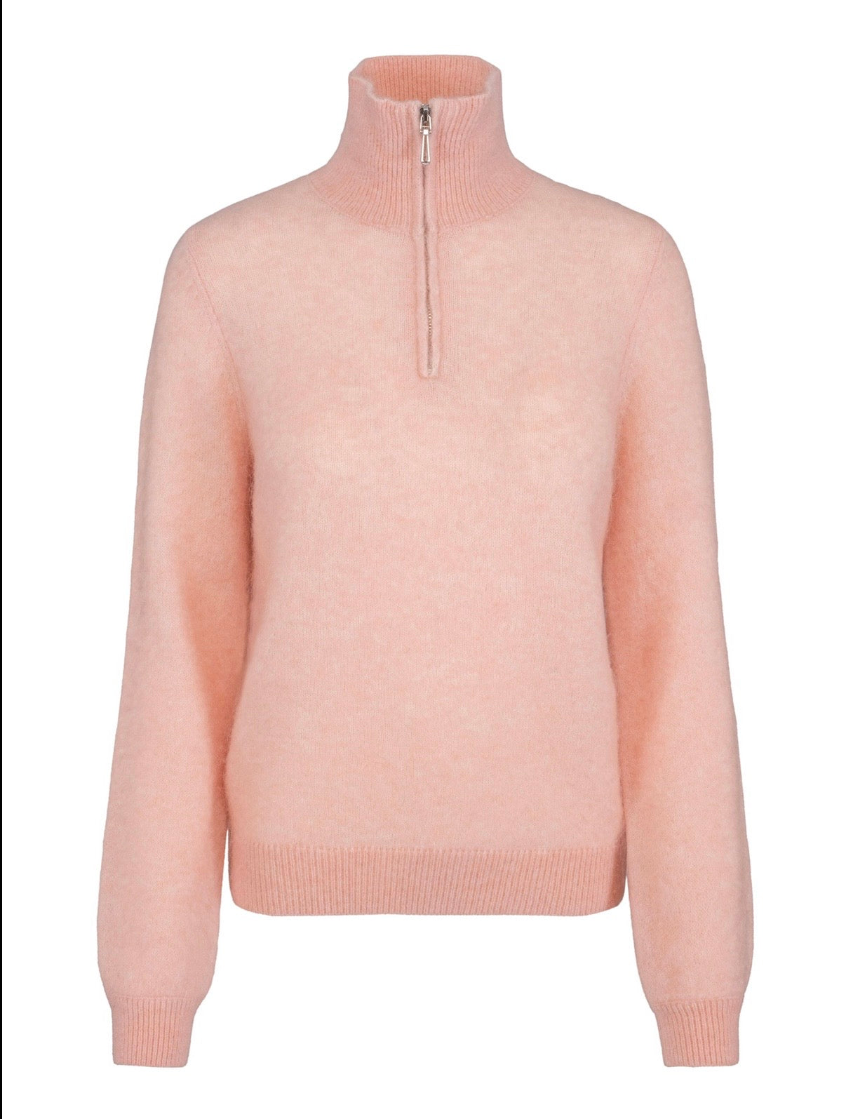 En myk og lett strikkegenser med halv glidelås og høy hals. Genseren er laget i en eksklusiv mohairblanding som gjør den varm; luftig og behagelig å ha på. Den delikate nude peach-fargen gir et friskt og moderne uttrykk – like fin til jeans som til skjørt.