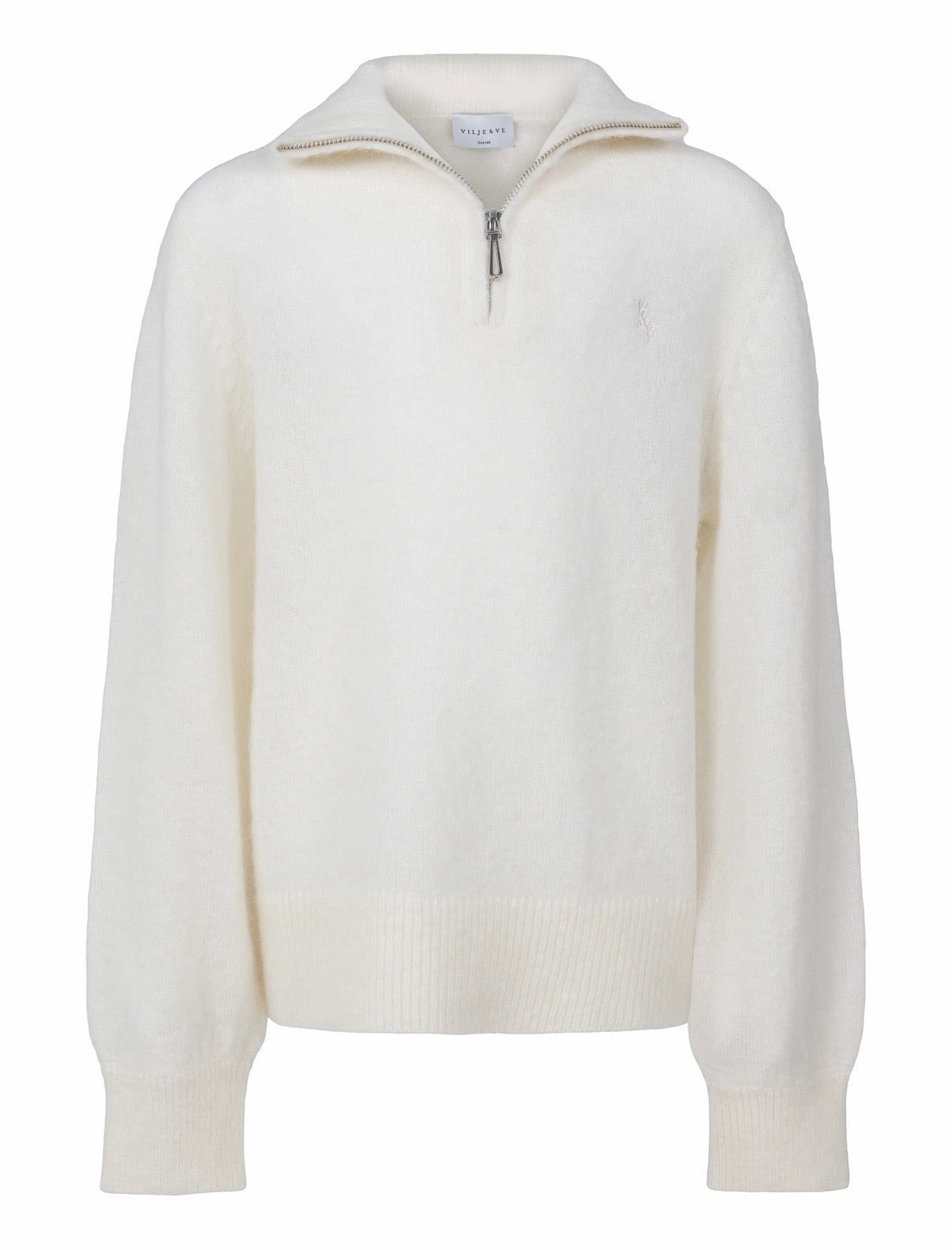 Kul; oversized strikkegenser til jente. Strikket i en supermyk og eksklusiv blanding av kidmohair og ull; med litt nylon og spandex for god passform og bevegelighet (33 % mohair; 33 % ull; 28 % nylon; 6 % spandex). Har delikate strikkedetaljer og en moderne half-zip glidelås i front.
