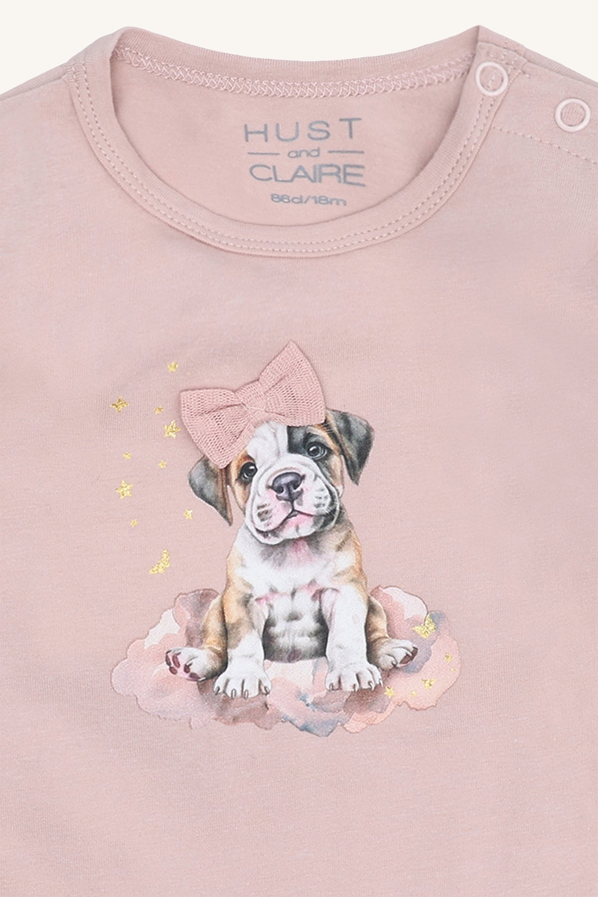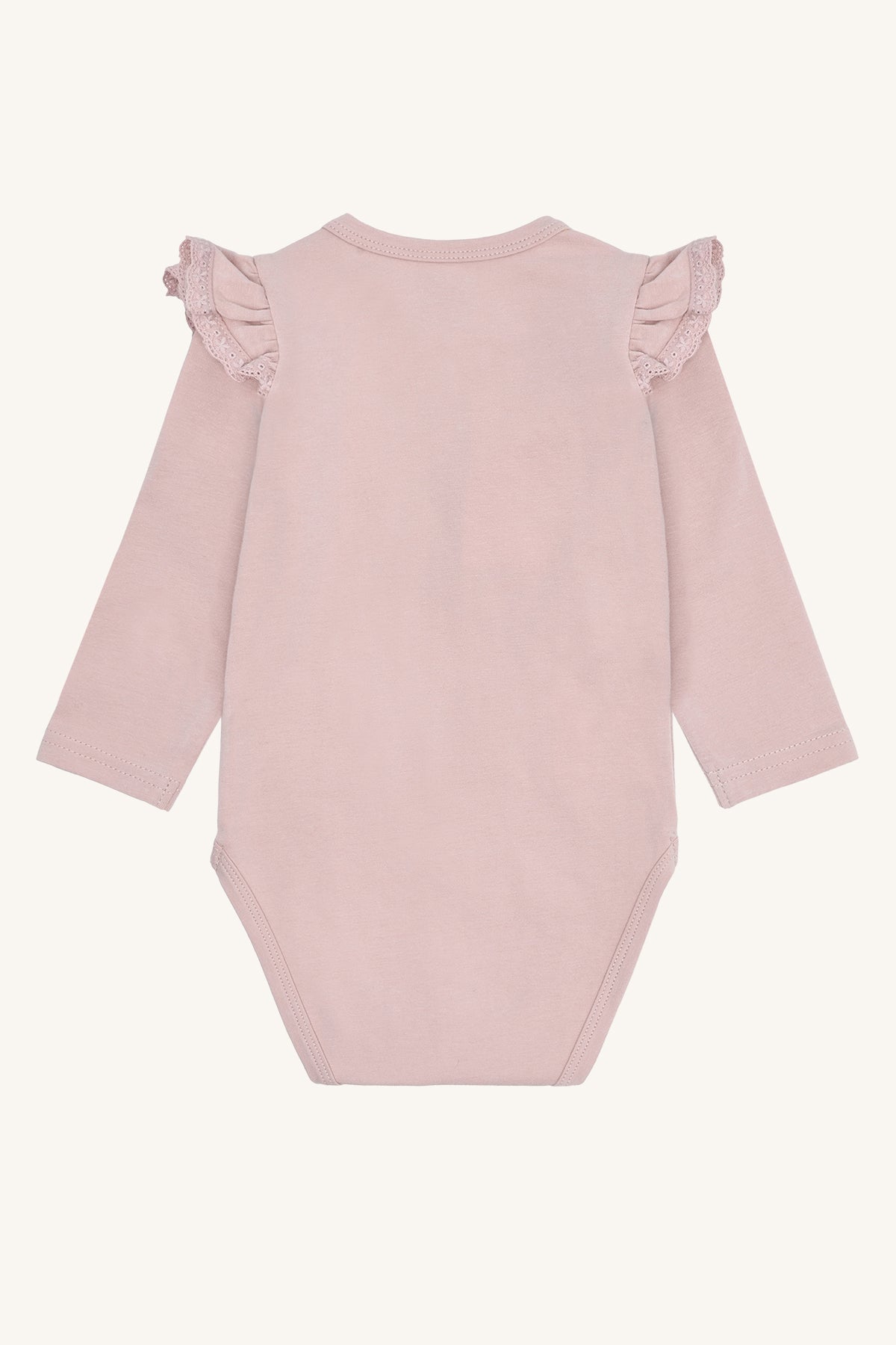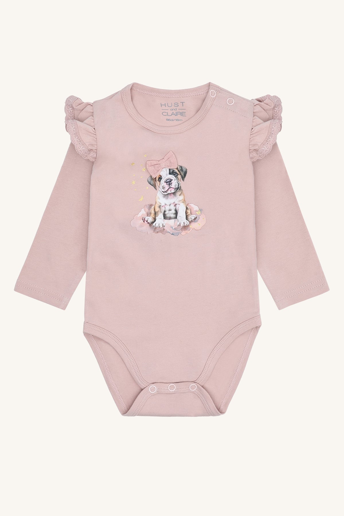 Nydelig body fra Hust&Claire med en liten hund og rysjer på skuldrene.
