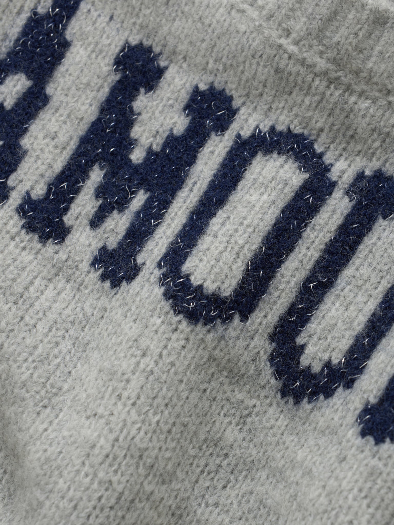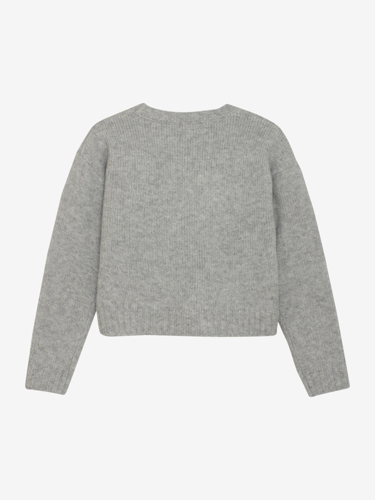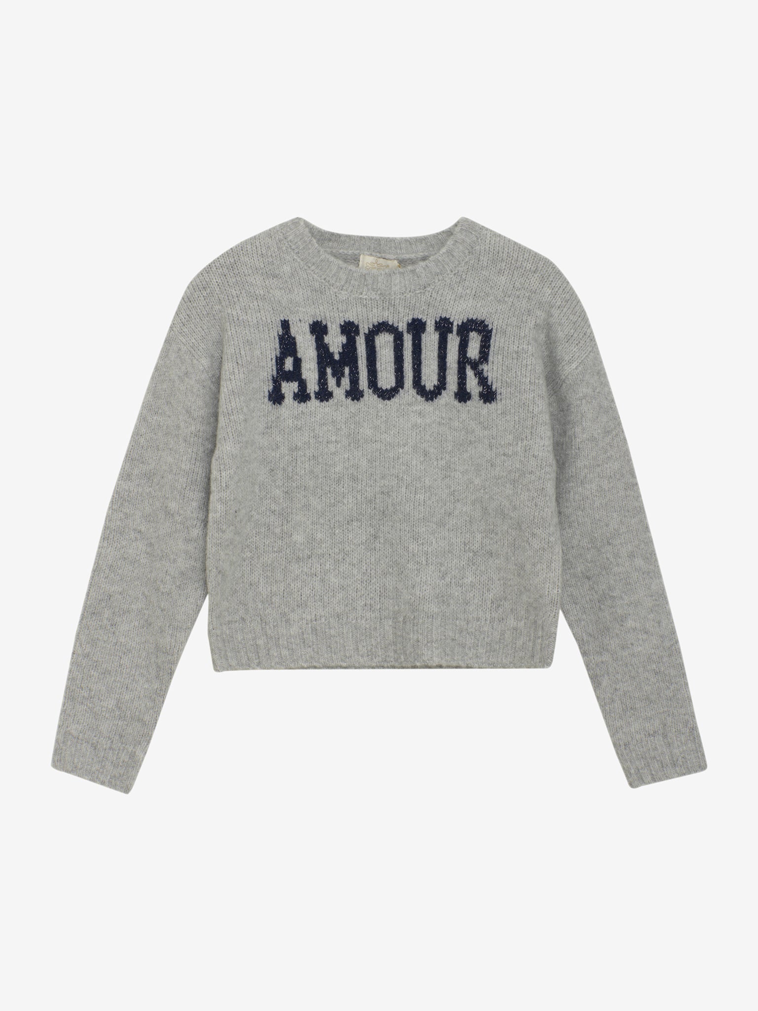 Smart strikkebluse med skrift foran fra Creamie. Blusen har lange ermer og rund halsutringning, med ribbestrikket kant. I ermehullene og nederst er det brede ribbekanter. Blusen er laget i en deilig og myk kvalitet.