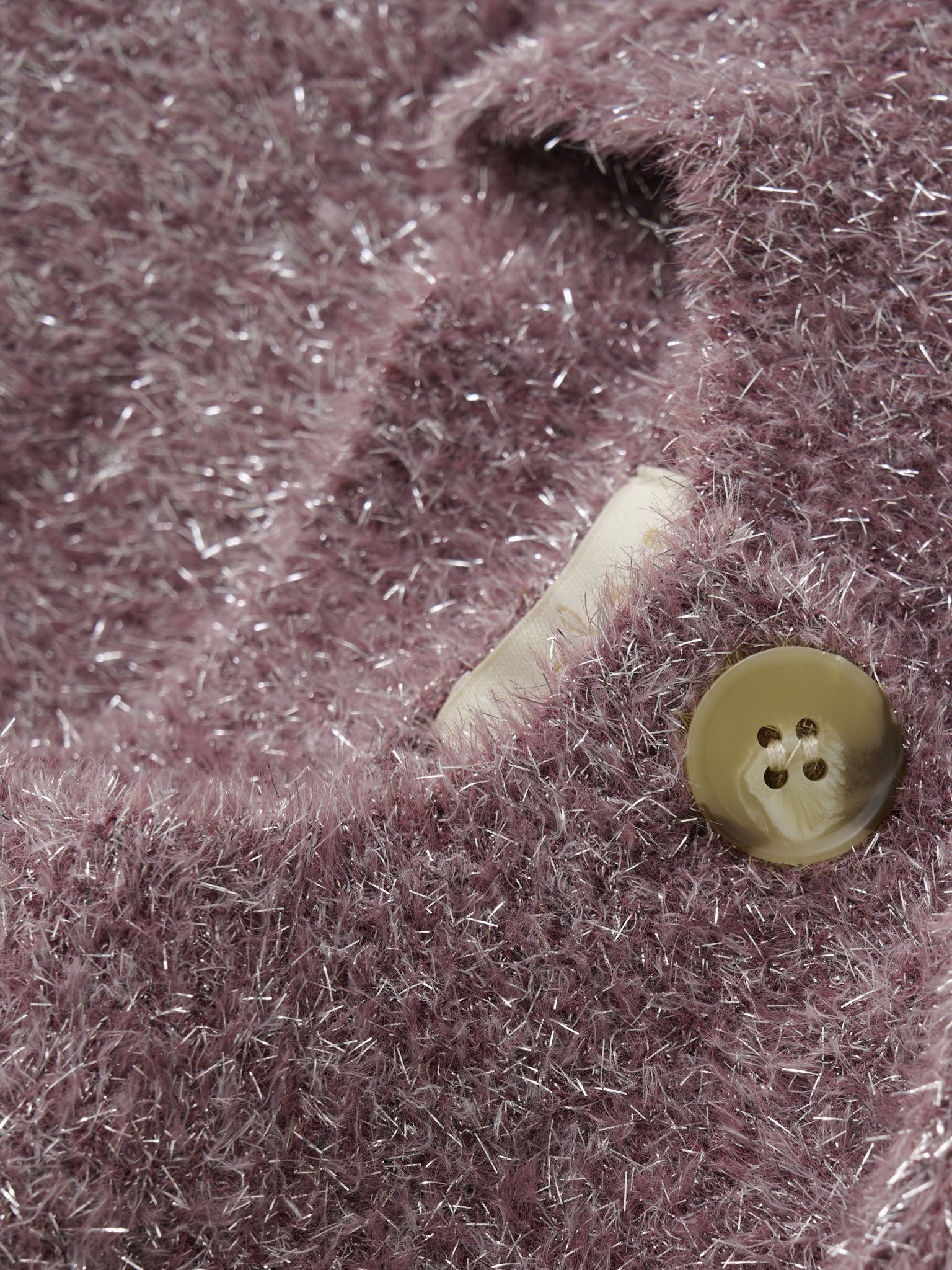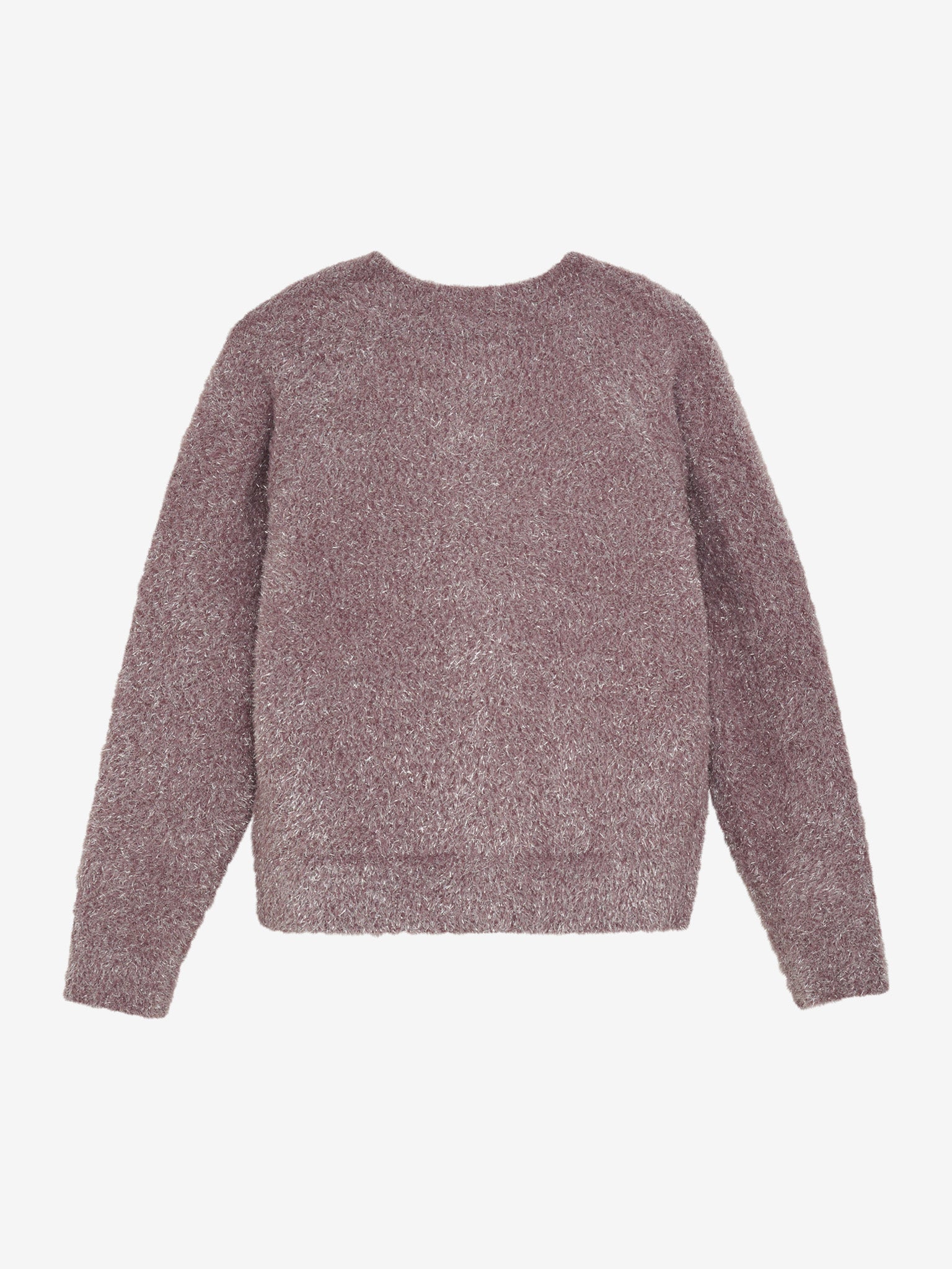 Fin cardigan fra Creamie med glitter. Cardiganen har rund hals og gjennomgående knapper. Det er ribbekant ved ermeåpningen og nederst.