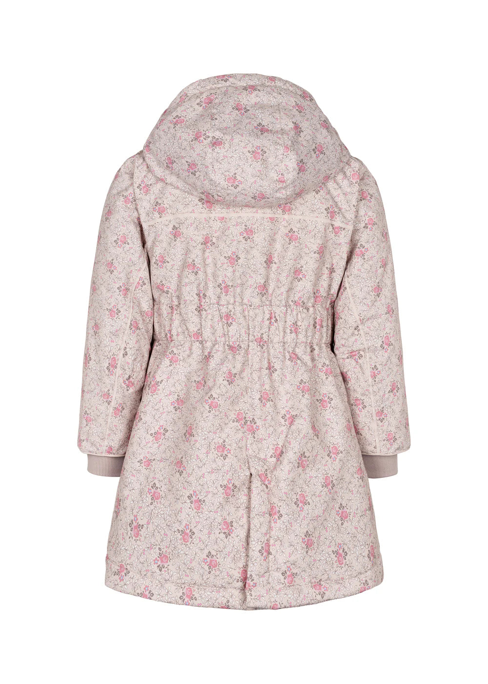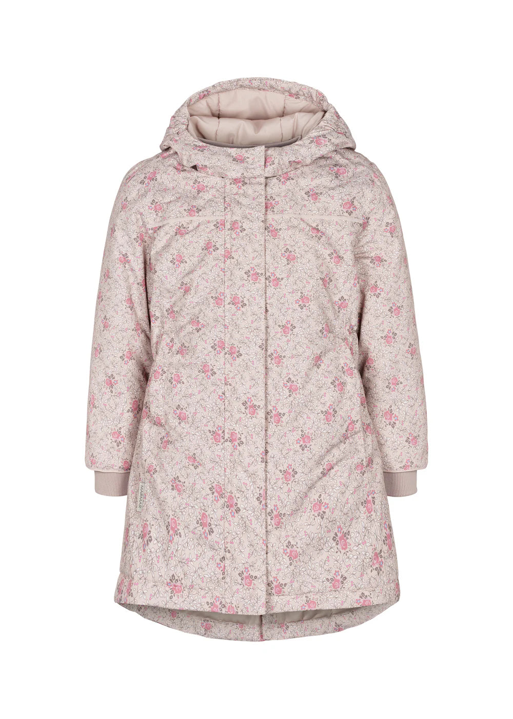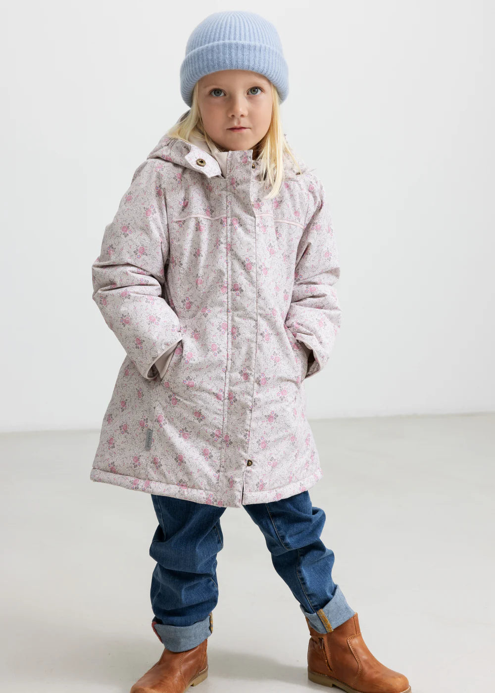 Vinterjakke for barn som er lang, praktisk og feminin med strikk i livet. Vinterjakken har to lommer på siden og en avtakbar hette. Jakken er perfekt vinterytterplagg i slitesterkt materiale og med termolitt-isolasjon som sikrer en varm og temperert kroppstemperatur.