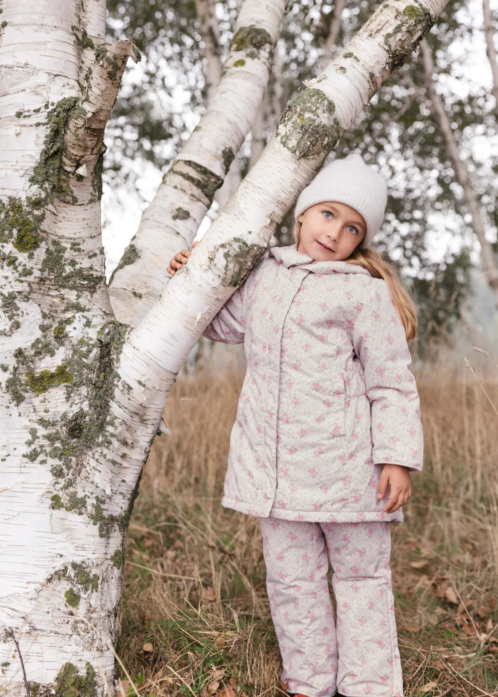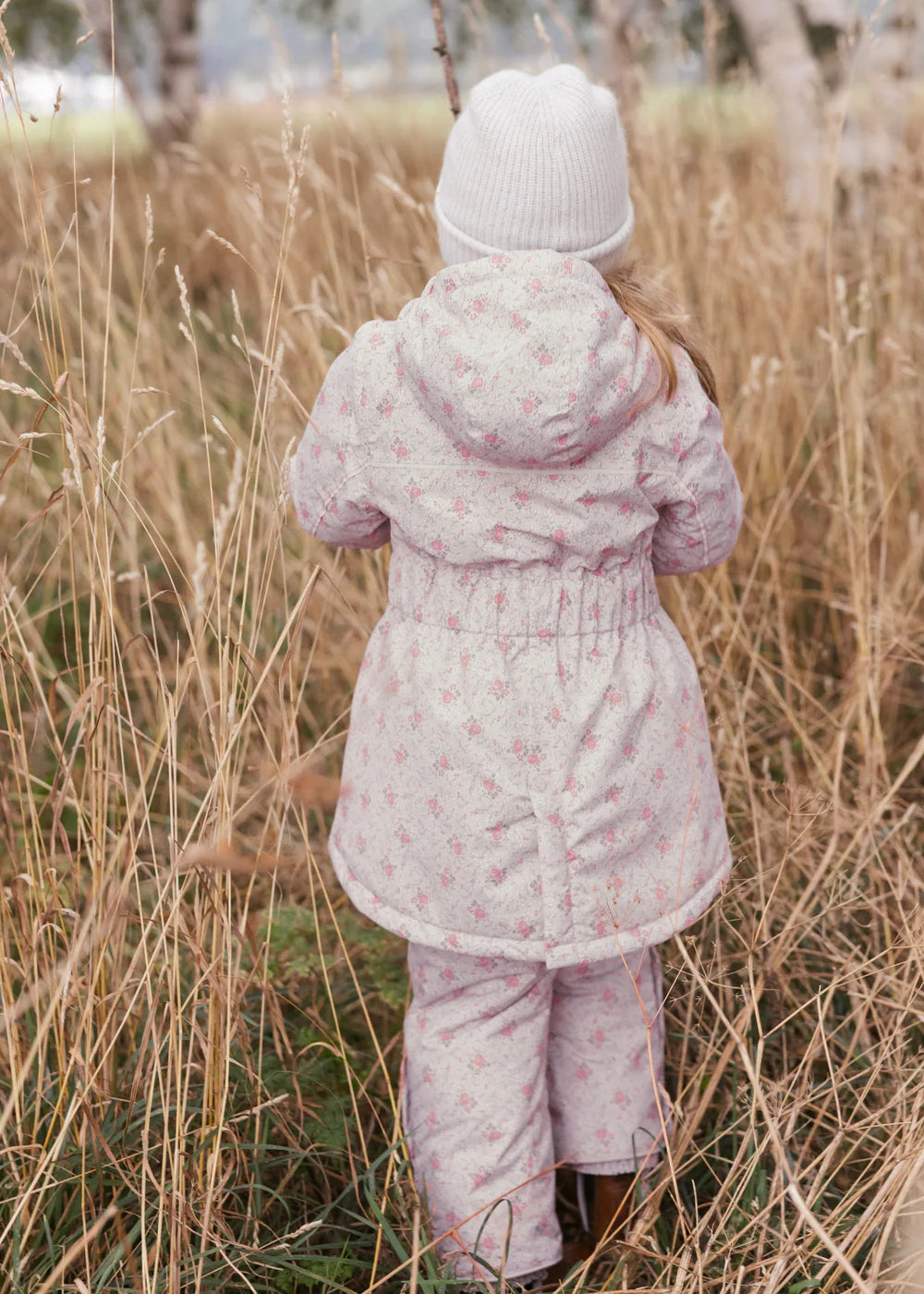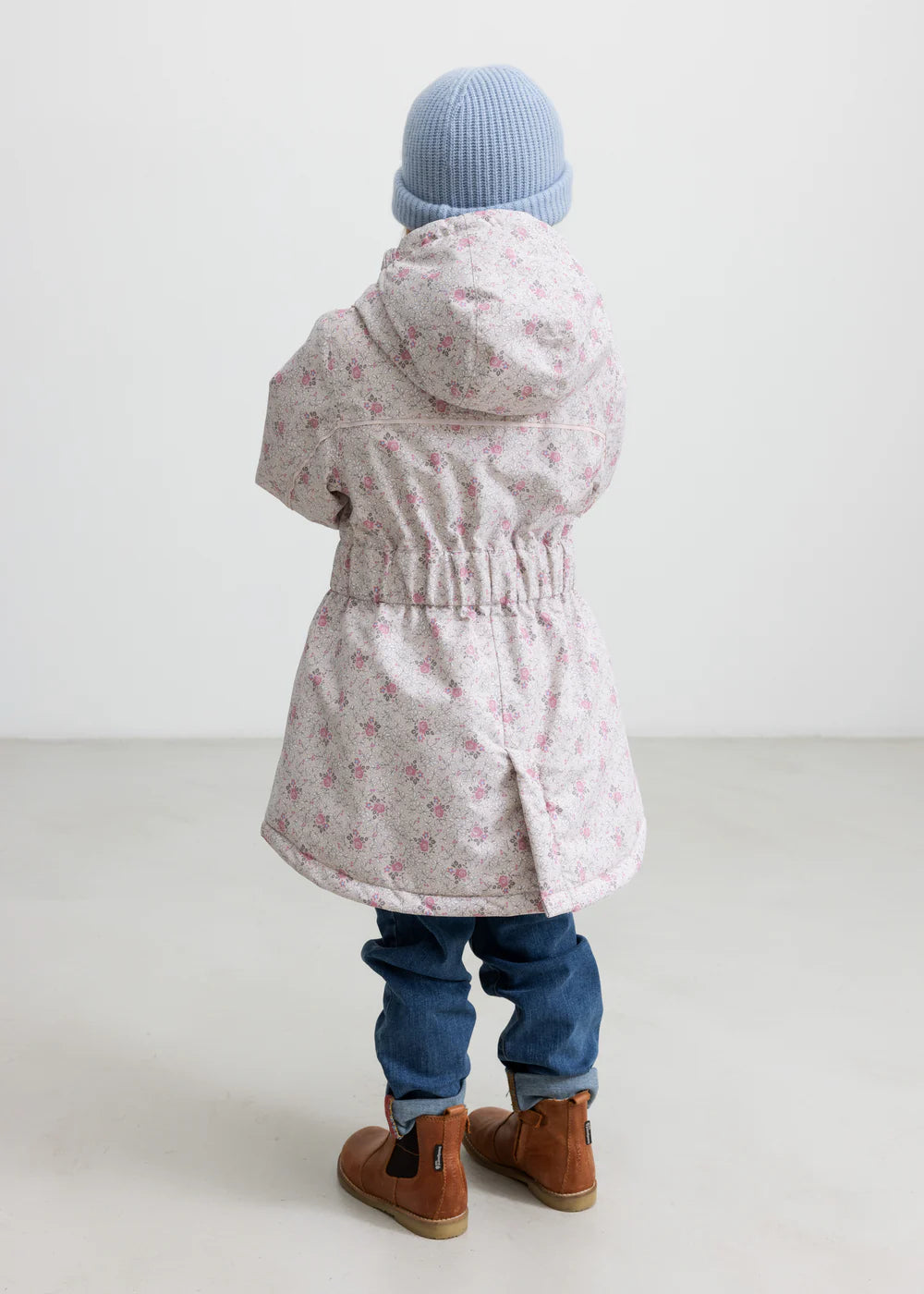 Vinterjakke for barn som er lang, praktisk og feminin med strikk i livet. Vinterjakken har to lommer på siden og en avtakbar hette. Jakken er perfekt vinterytterplagg i slitesterkt materiale og med termolitt-isolasjon som sikrer en varm og temperert kroppstemperatur.