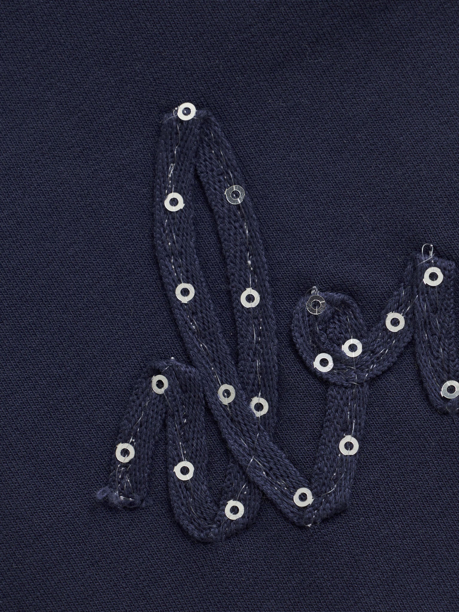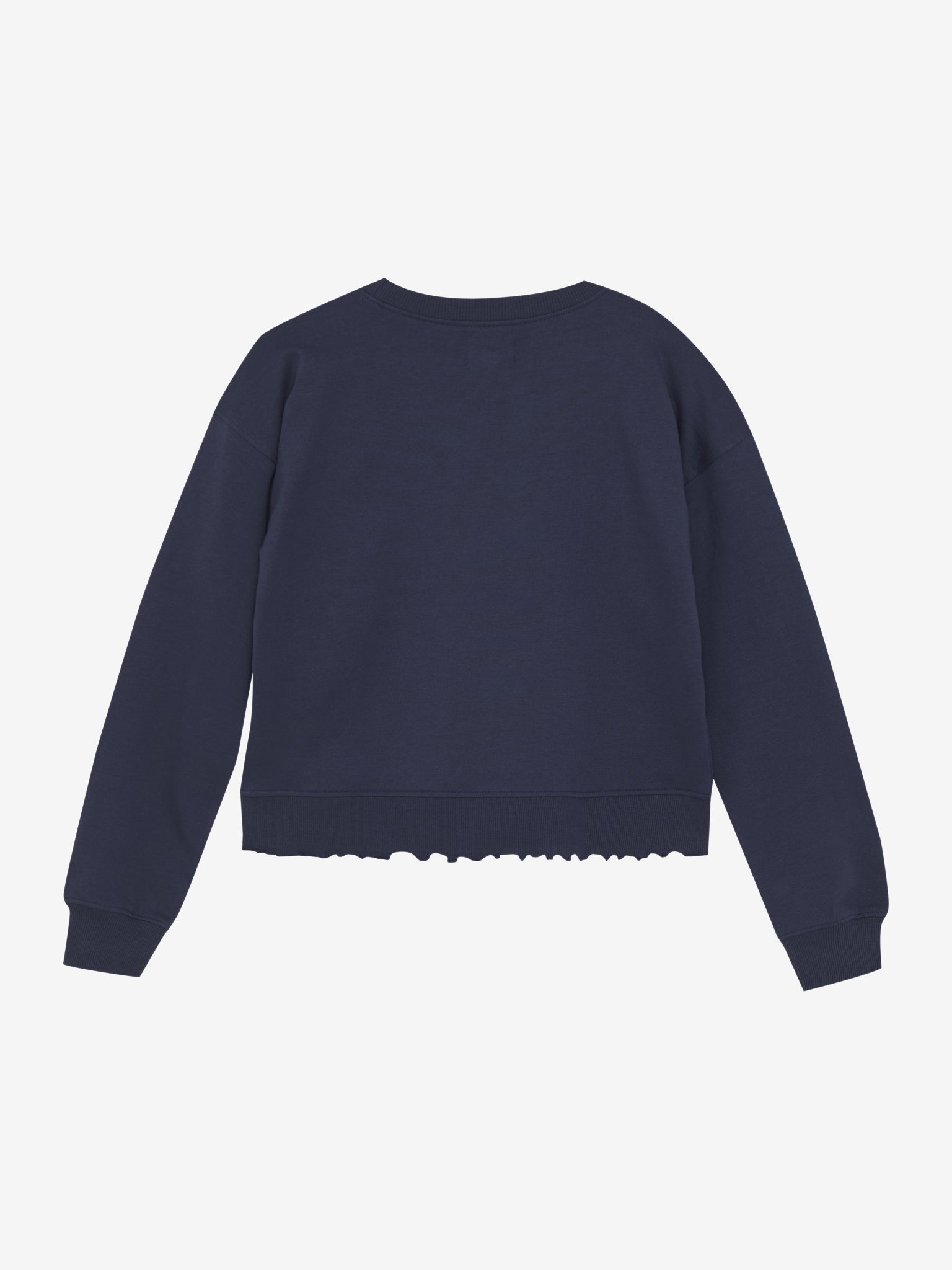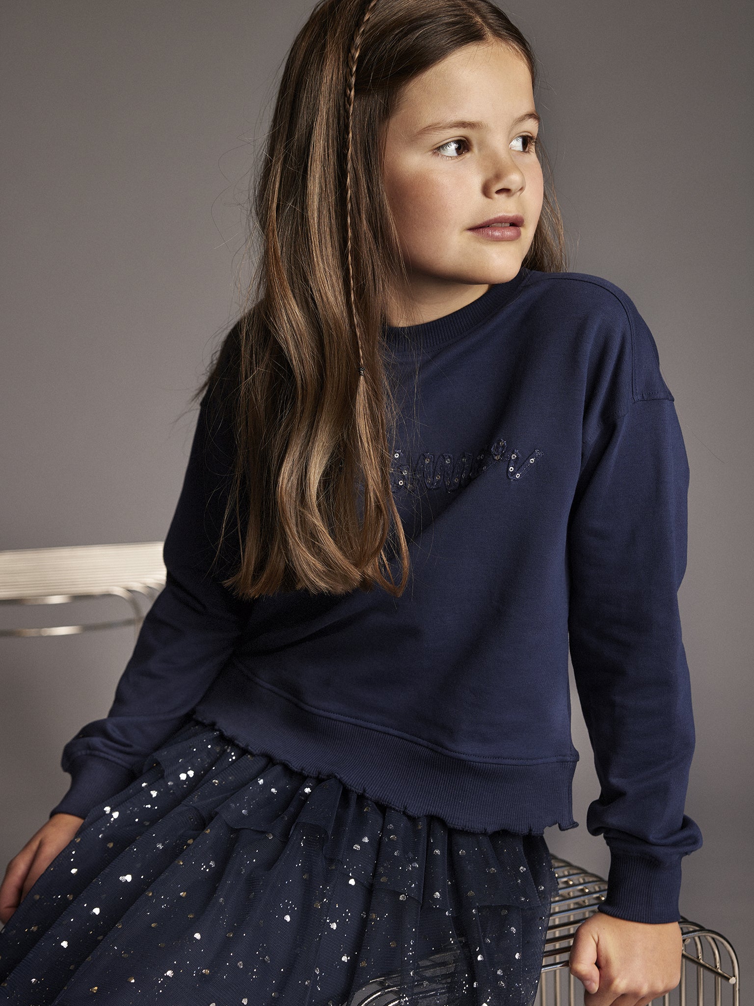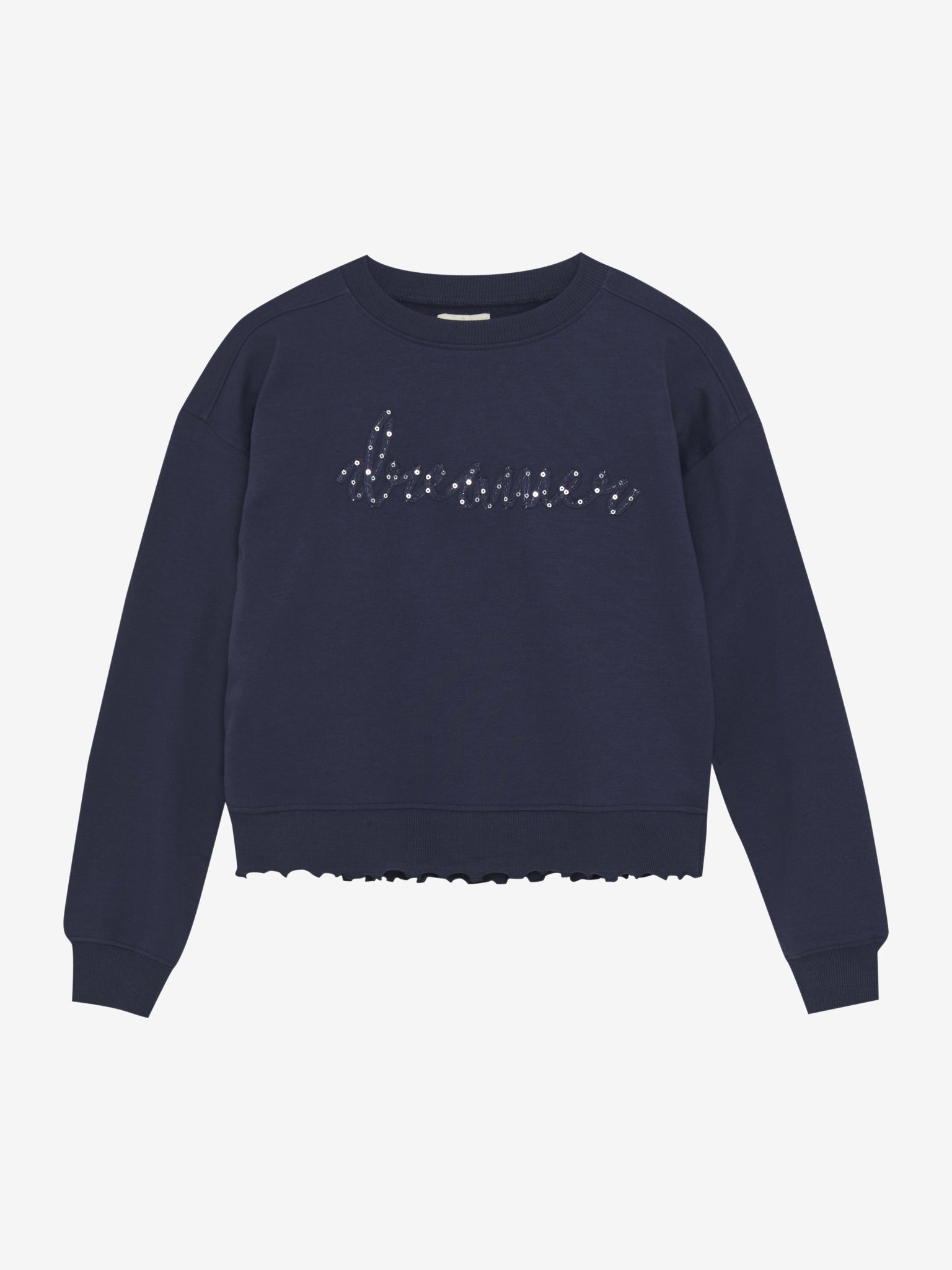 Smart Creamie-genser i blått med trykk og paljetter. Det er ribbekanter i alle åpninger og skuldersømmen er plassert lenger nede enn vanlig, noe som gir et "baggy" utseende.
