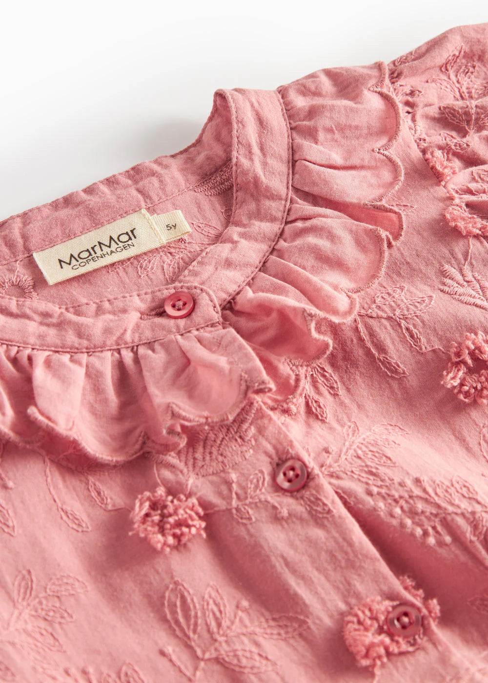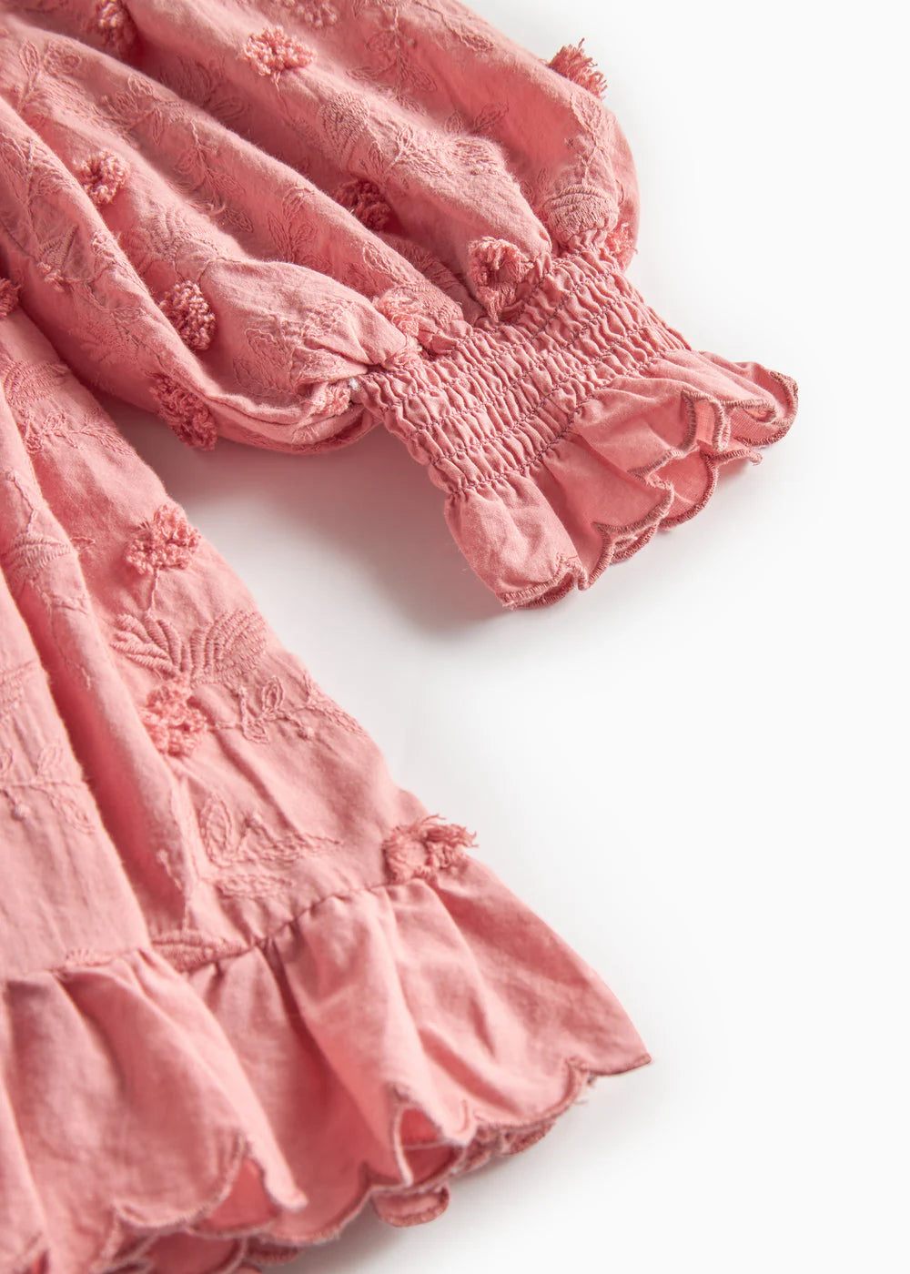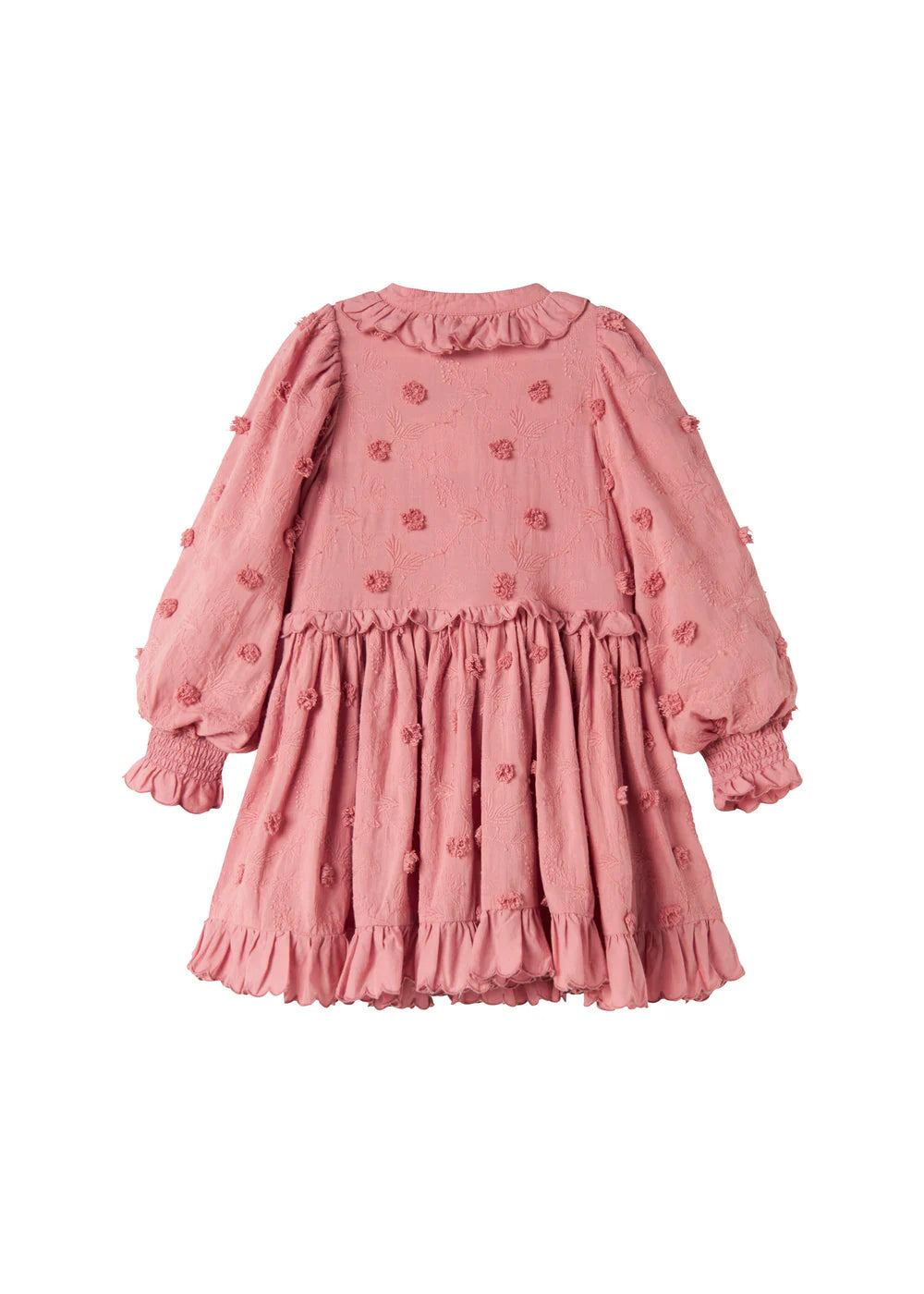 Barnekjole med unik broderi og små blomster. Kjolen har fine rysjer på skuldrene og kanten, voluminøse ermer med vaffelsøm ved håndleddene og knappelukking foran. Kjolen går over kneet og er perfekt for både hverdags og festlige anledninger.