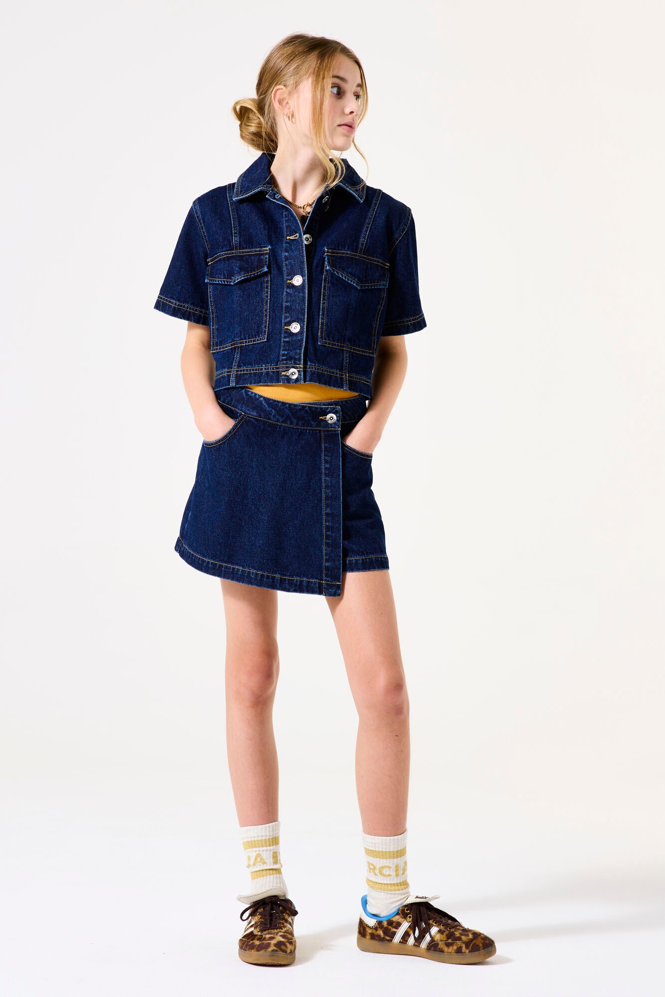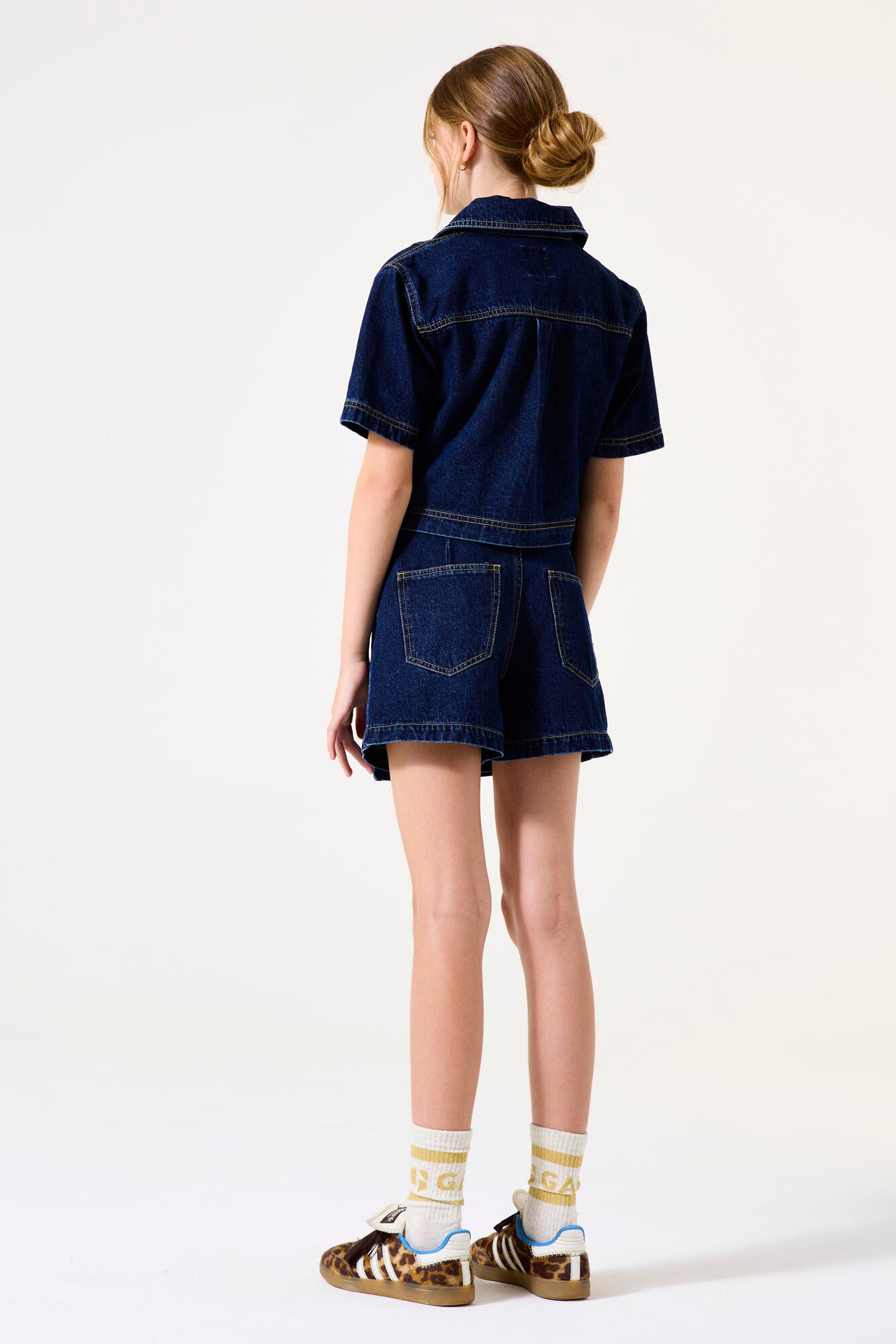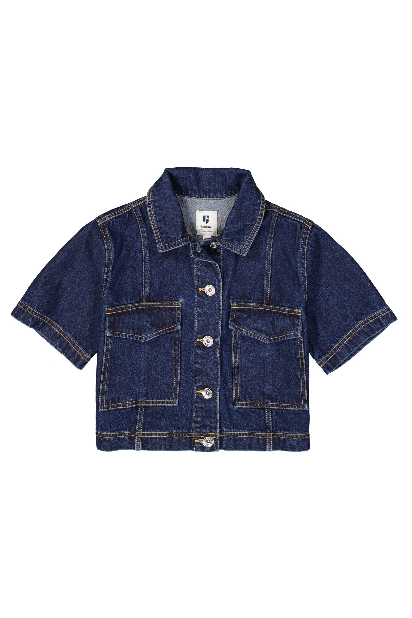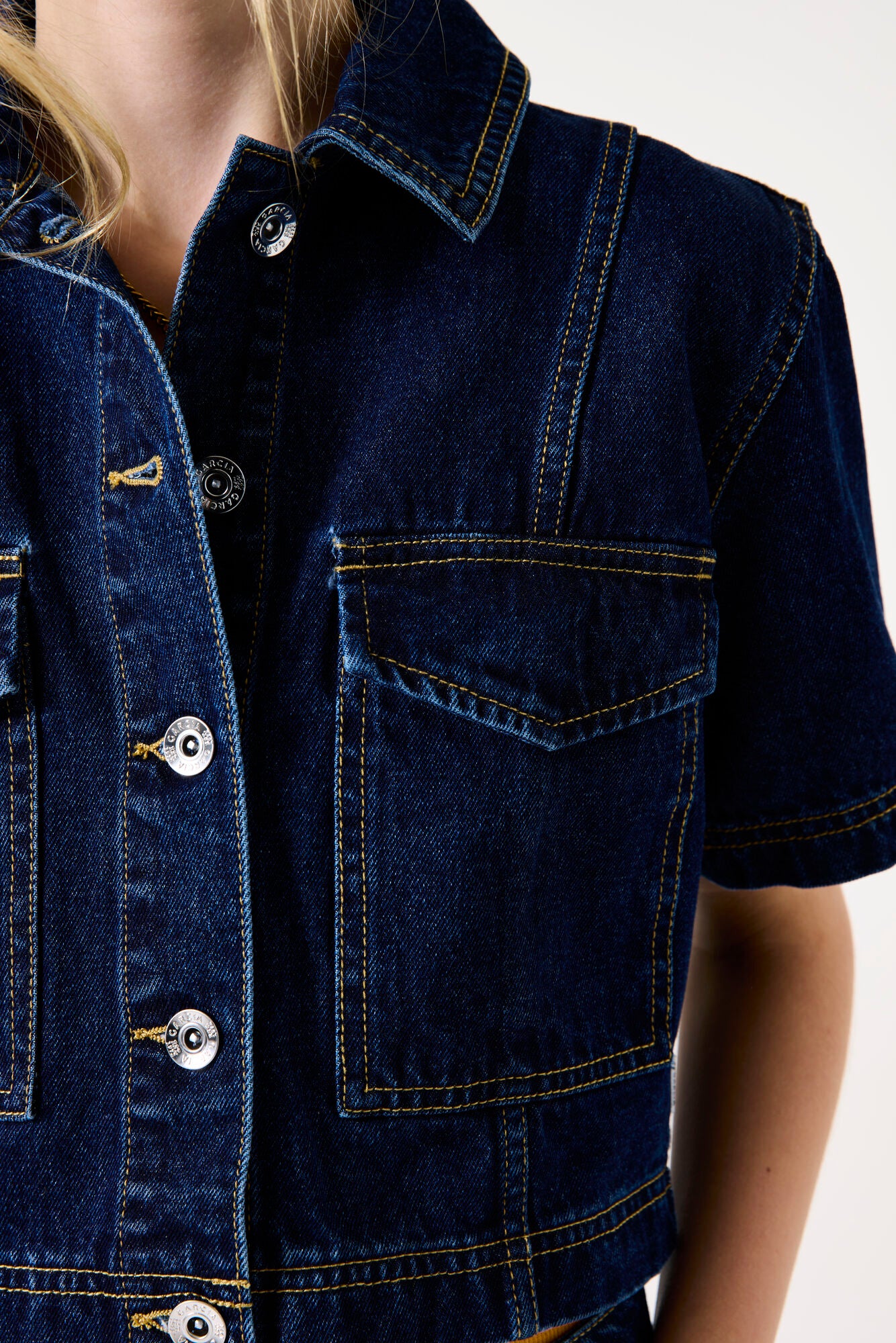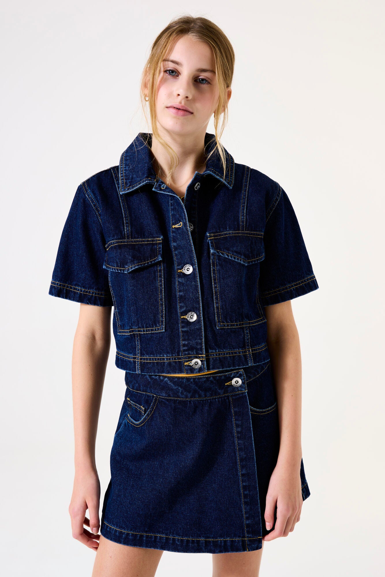 Kort denimjakke med knappelukking. Denne jakken har en klassisk krage, korte ermer og en avslappet passform. Dette plagget er laget av 80 % bomull og 20 % resirkulert bomull. Superkul style for høsten!