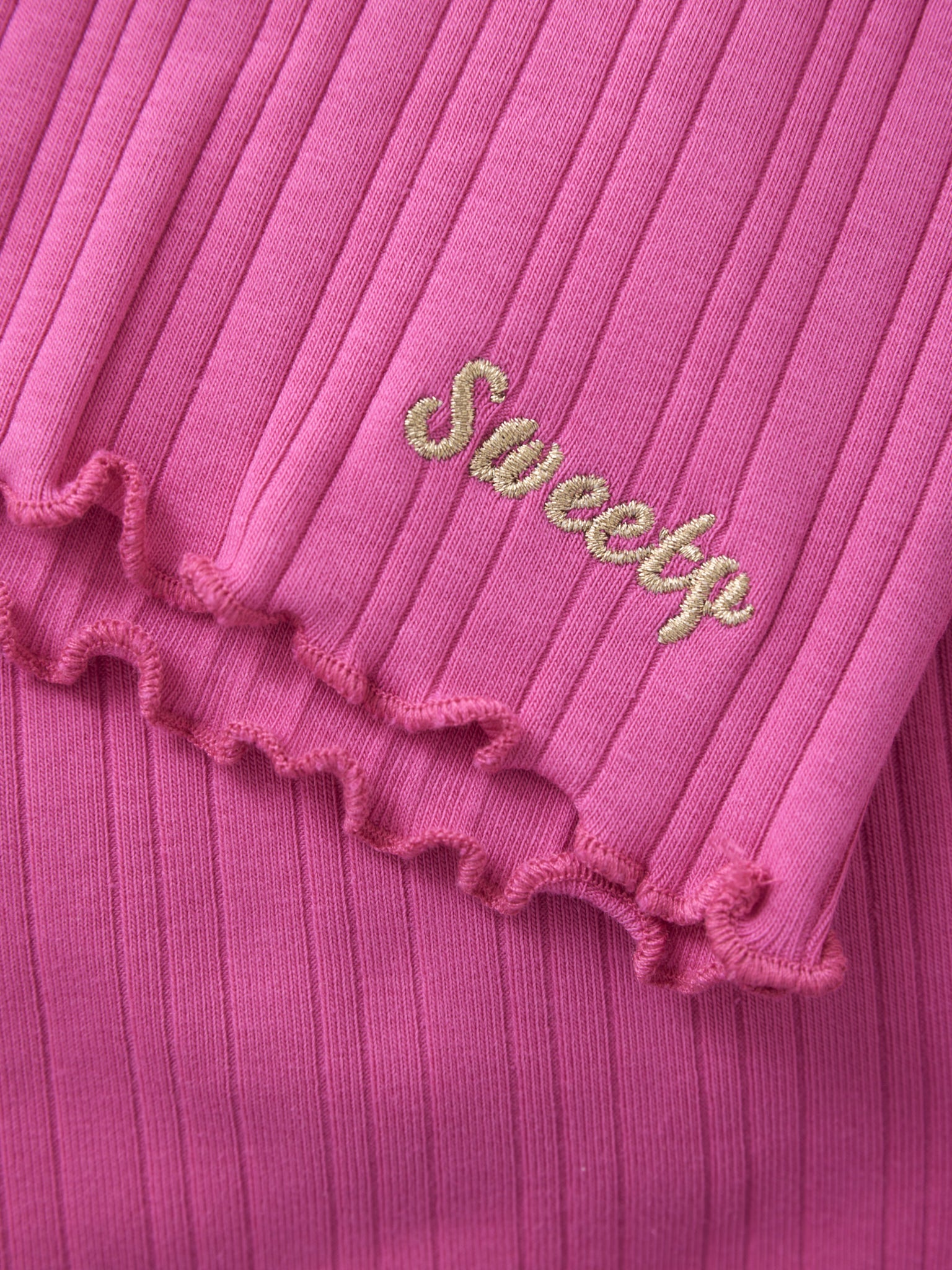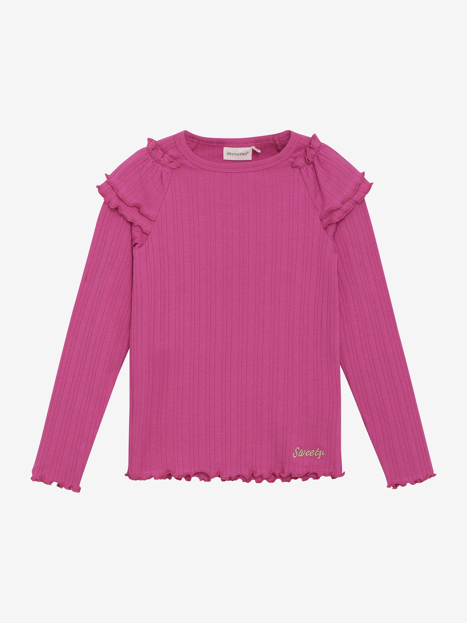 Langermet ribbestrikket T-skjorte med delikate rysjer på skuldrene. En perfekt blanding av komfort og stil.