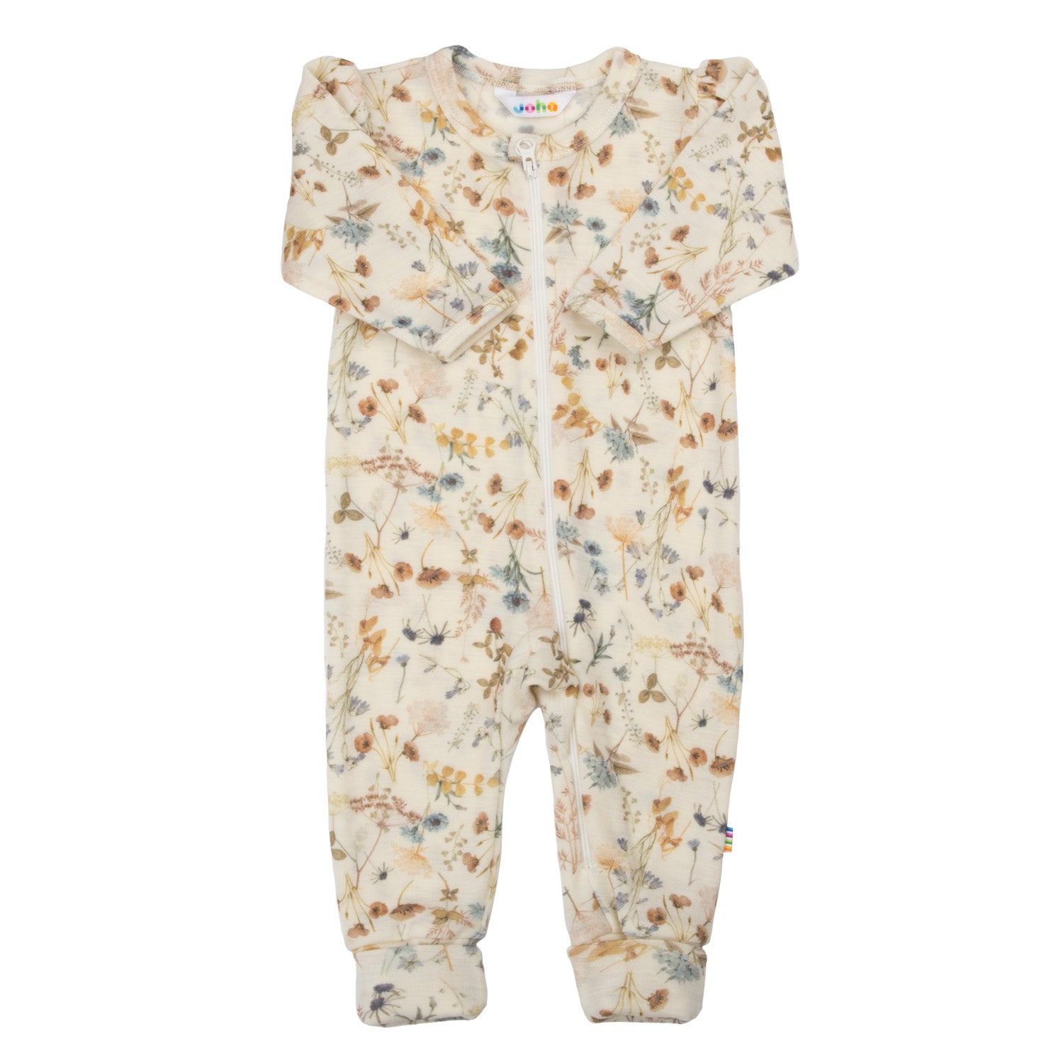 Jumpsuit med 2-i-1-fot. Lukkes med trykknapp i halsen og glidelås som går nedover det ene benet for enklere påkledning. En deilig myk og elastisk ullkvalitet. Vakkert digitaltrykk med høstblomster. Ren merinoull og Oeko-tex 100-merke.