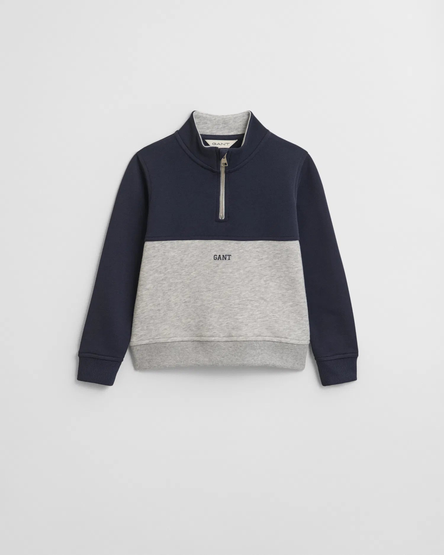Denne barnesgenseren er et hverdagsprodukt, laget i en bomullsblandingskvalitet for en autentisk følelse. Designet for en avslappet passform, har den en sporty halvglidelåskrage, fargeblokkering over hele kroppen og en GANT-grafikk trykt på brystet.