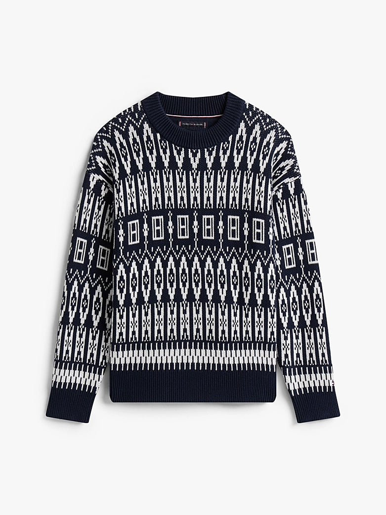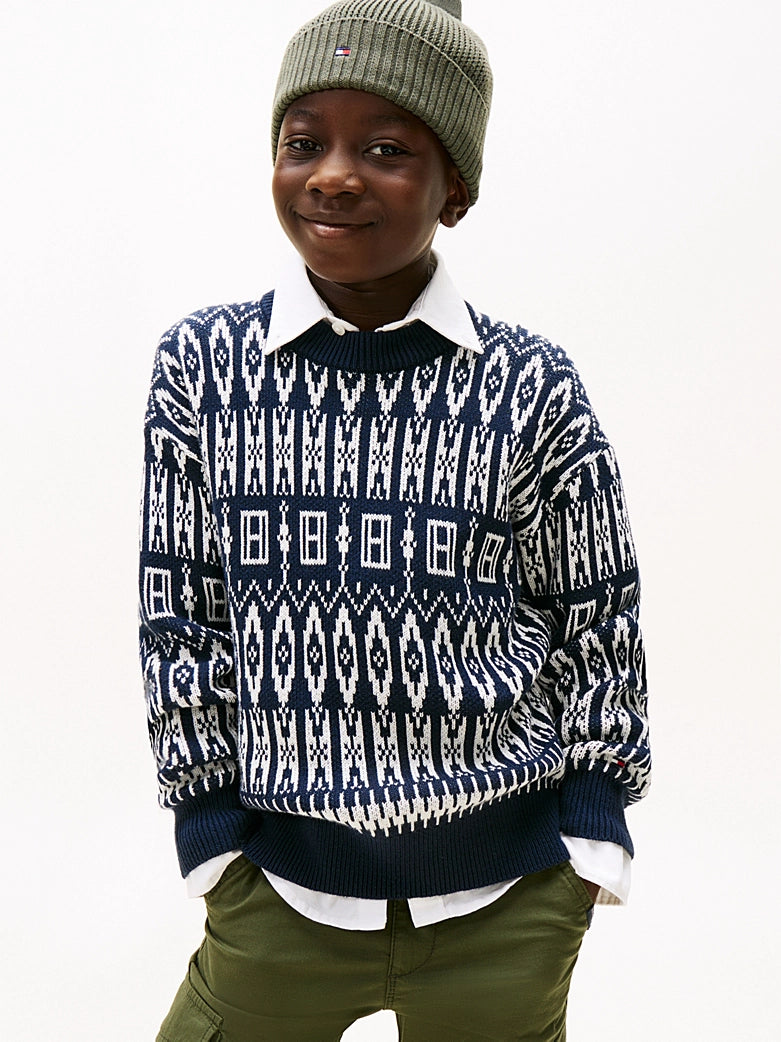Denne koselige genseren i ren kammet bomull har et tradisjonelt Fair Isle-mønster, som gir et klassisk preg til festgarderoben.