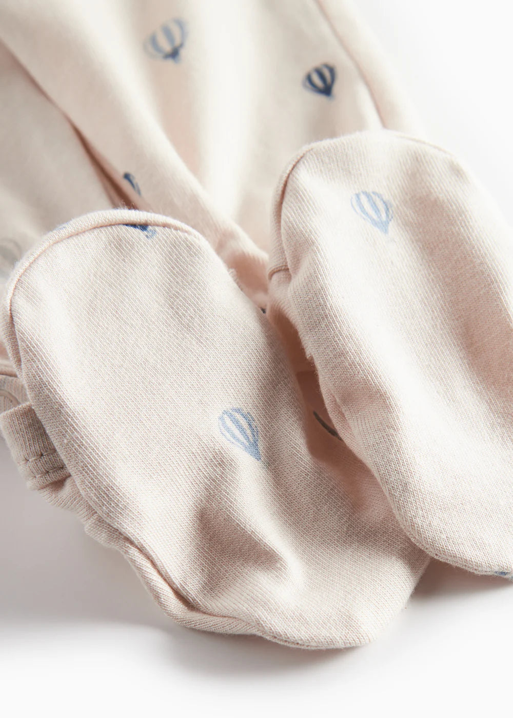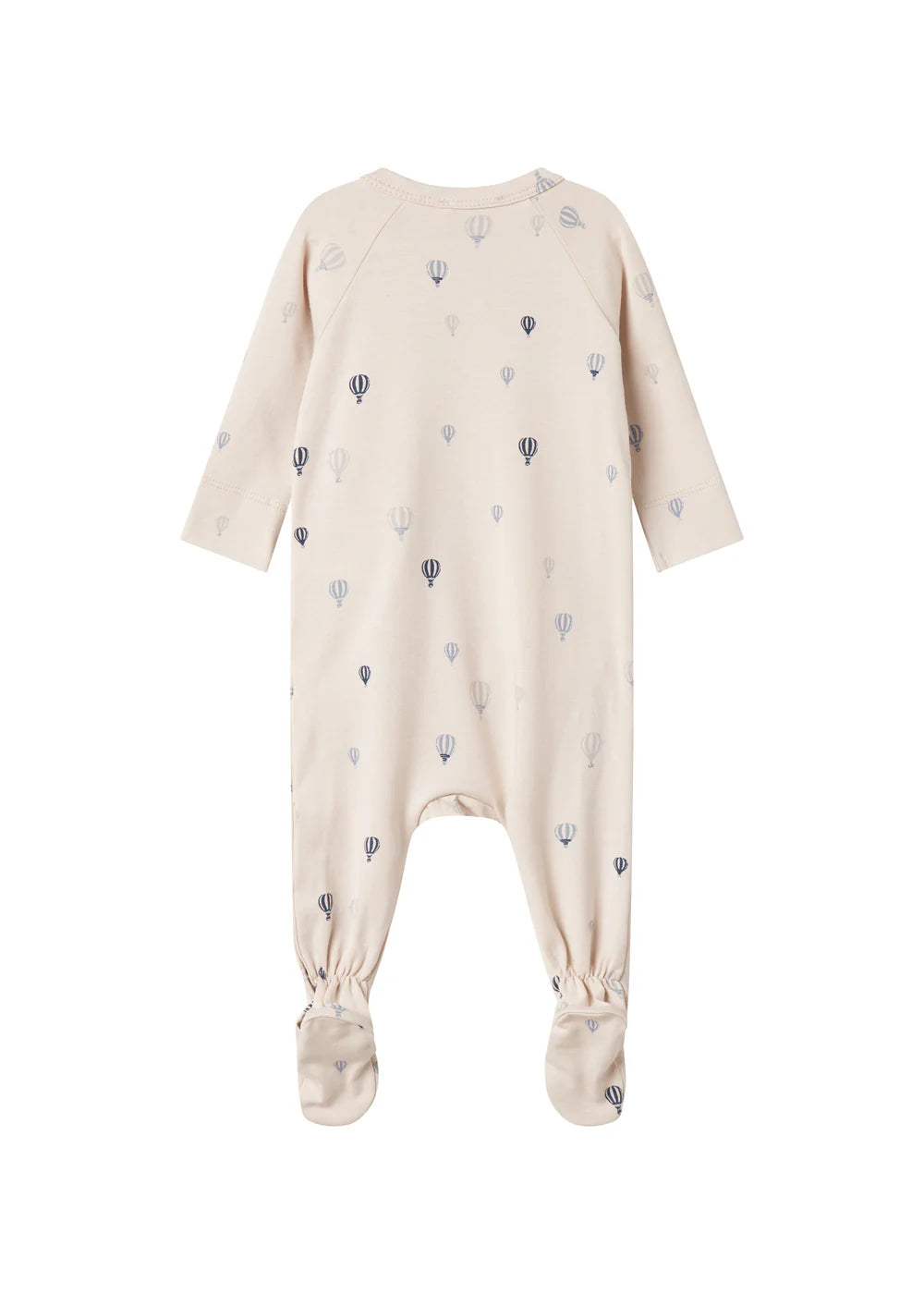 Langermet jumpsuit med føtter for nyfødte. Jumpsuiten har en omslagslukking og lukkes med trykknapper fra halsen og nedover det ene benet. Jumpsuiten har et fint trykk og er myk, elastisk og behagelig å ha på seg.