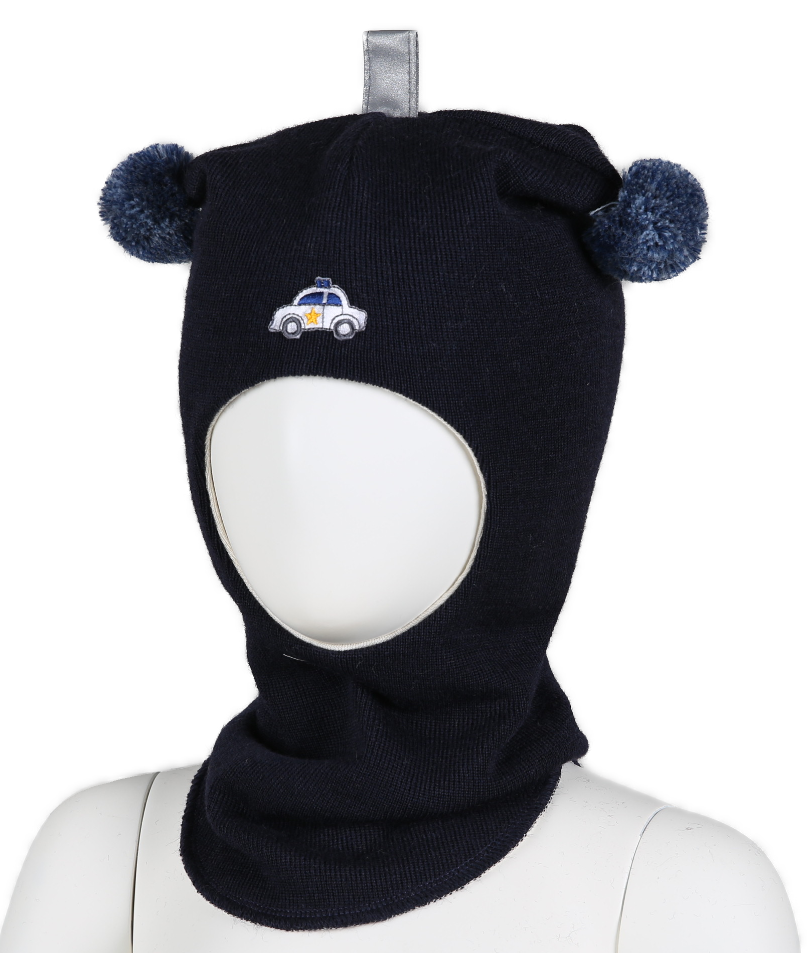 Kivat Balaklava I Glattstrikket Ull; Fôret Med Økologisk Bomull; Med To Dusker Og Politibil - Marineblå