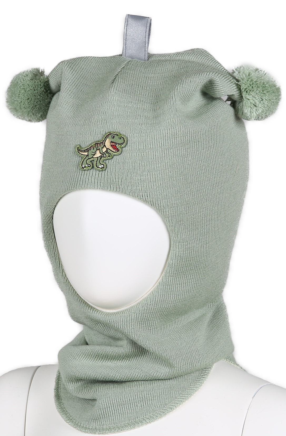 Kivat Balaklava I Glattstrikket Ull; Fôret Med Økologisk Bomull; Med To Dusker Og Dinosaur - Lysegrønn