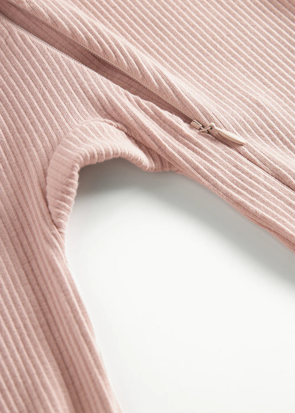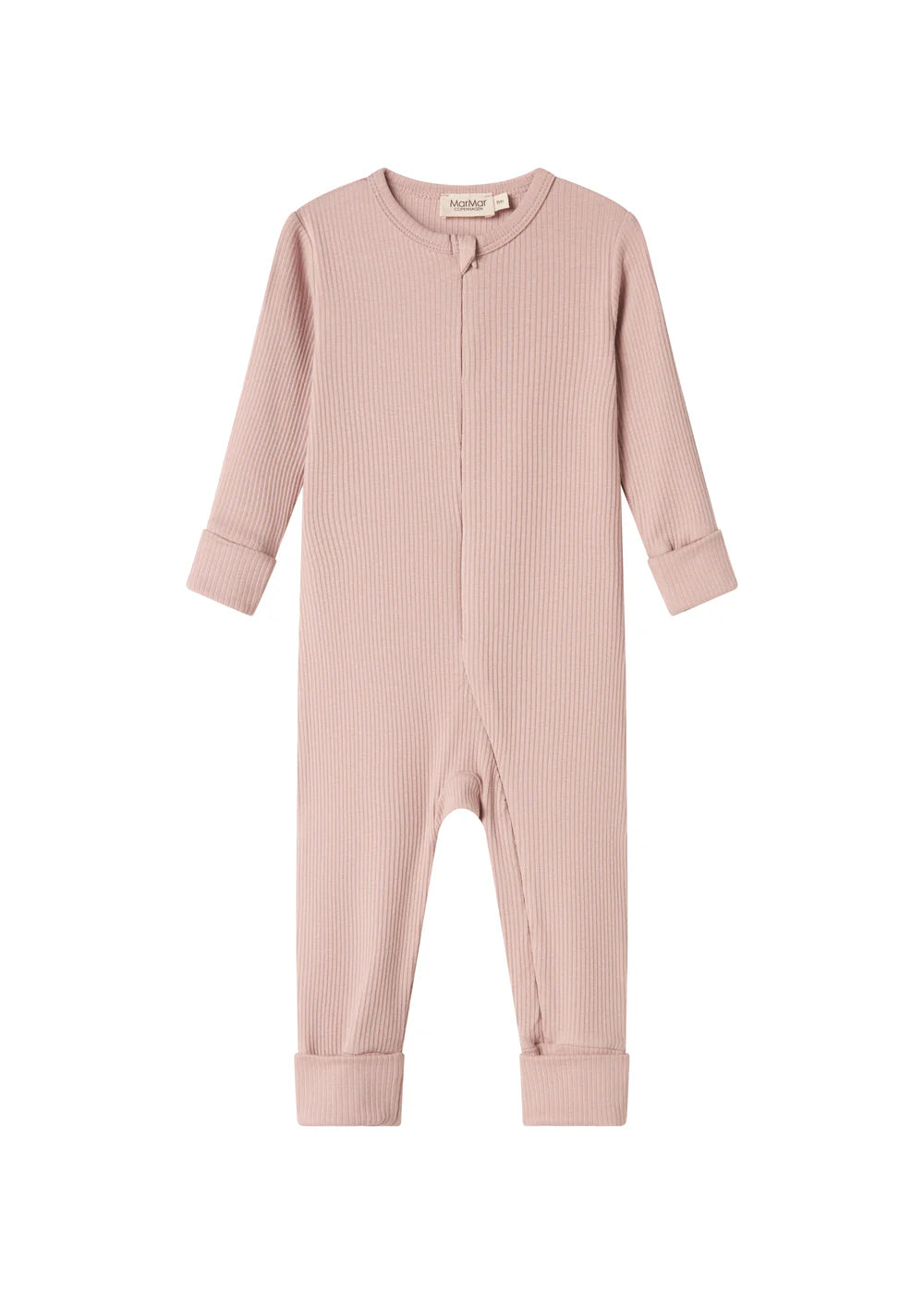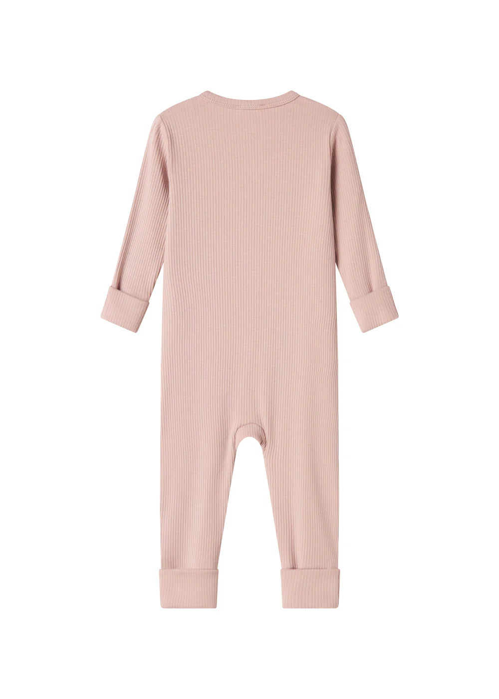 Enkel langermet jumpsuit som kan lukkes med glidelås helt fra halsen og ned langs det ene benet for enkelt bleieskift. Jumpsuiten har legg i både ermer og ben, som kan justeres etter hvert som barnet vokser. Jumpsuiten har også en sammenleggbar vott-/sokkefunksjon fra størrelse 2-4M. Jumpsuiten er ribbet, myk, elastisk og behagelig å ha på seg.