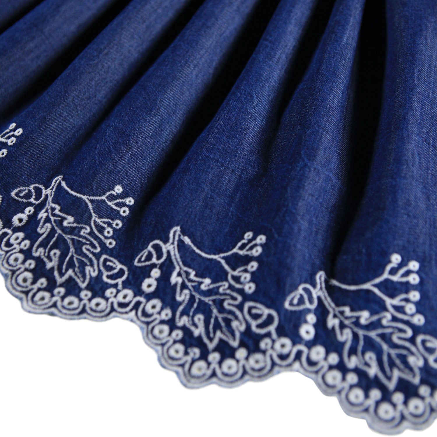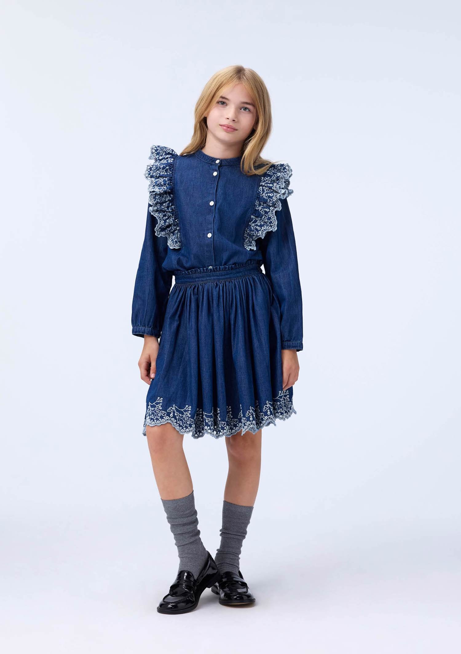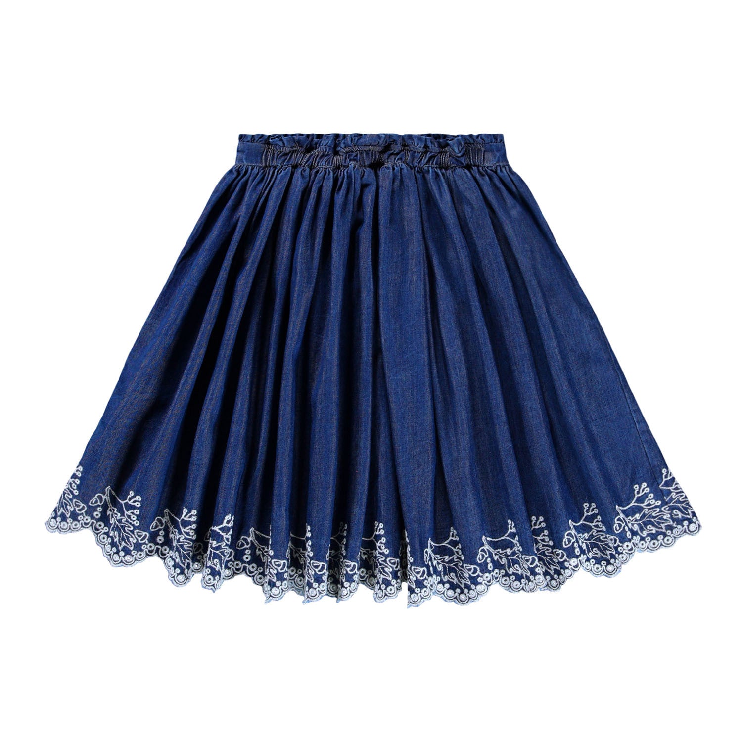 Blått skjørt laget av økologisk bomull chambray med hvitt broderi anglaise. Skjørtet går til kneet med en linning som er festet foran og strikk bak for å gjøre det enkelt å ta på og behagelig å ha på.