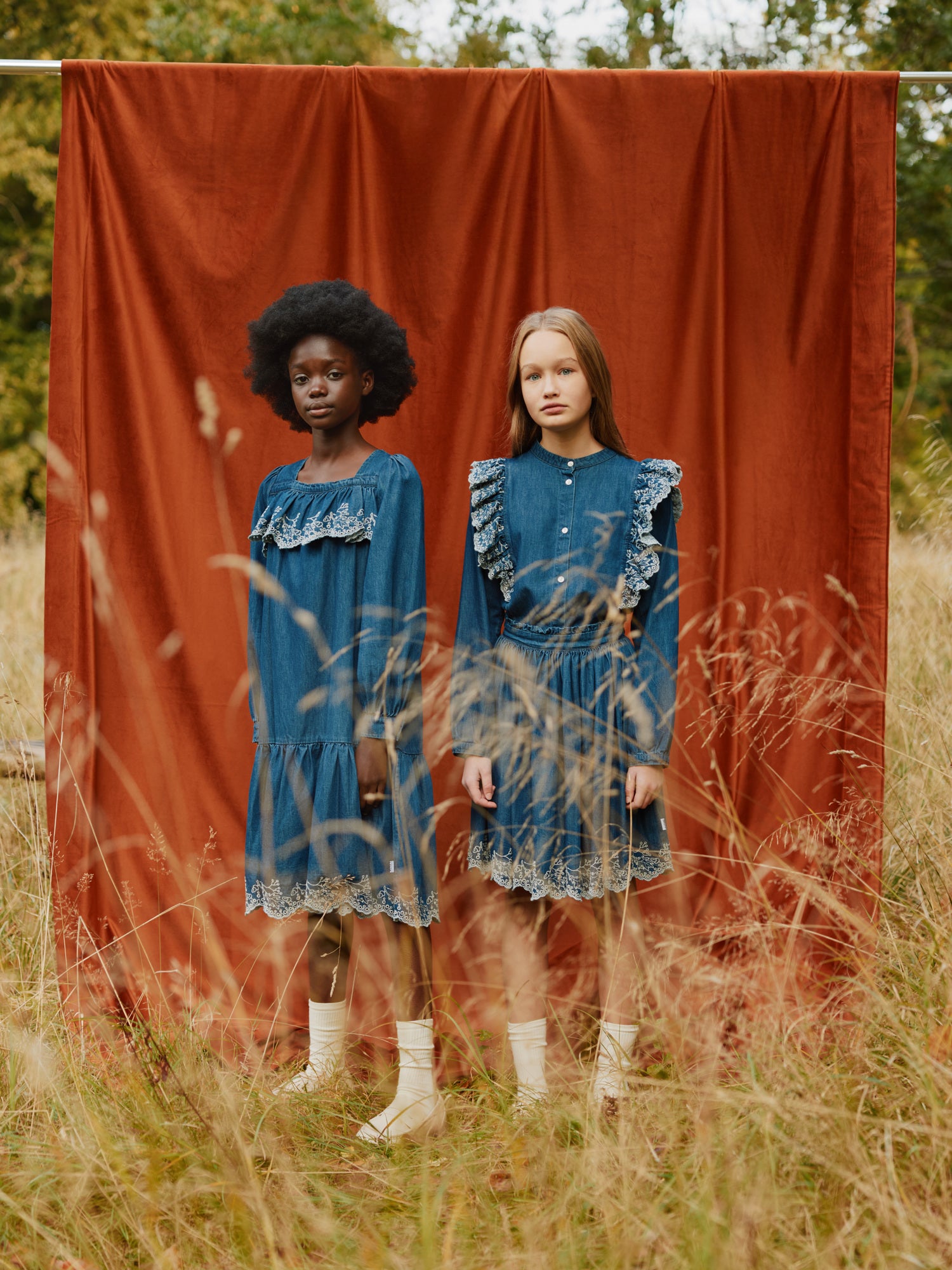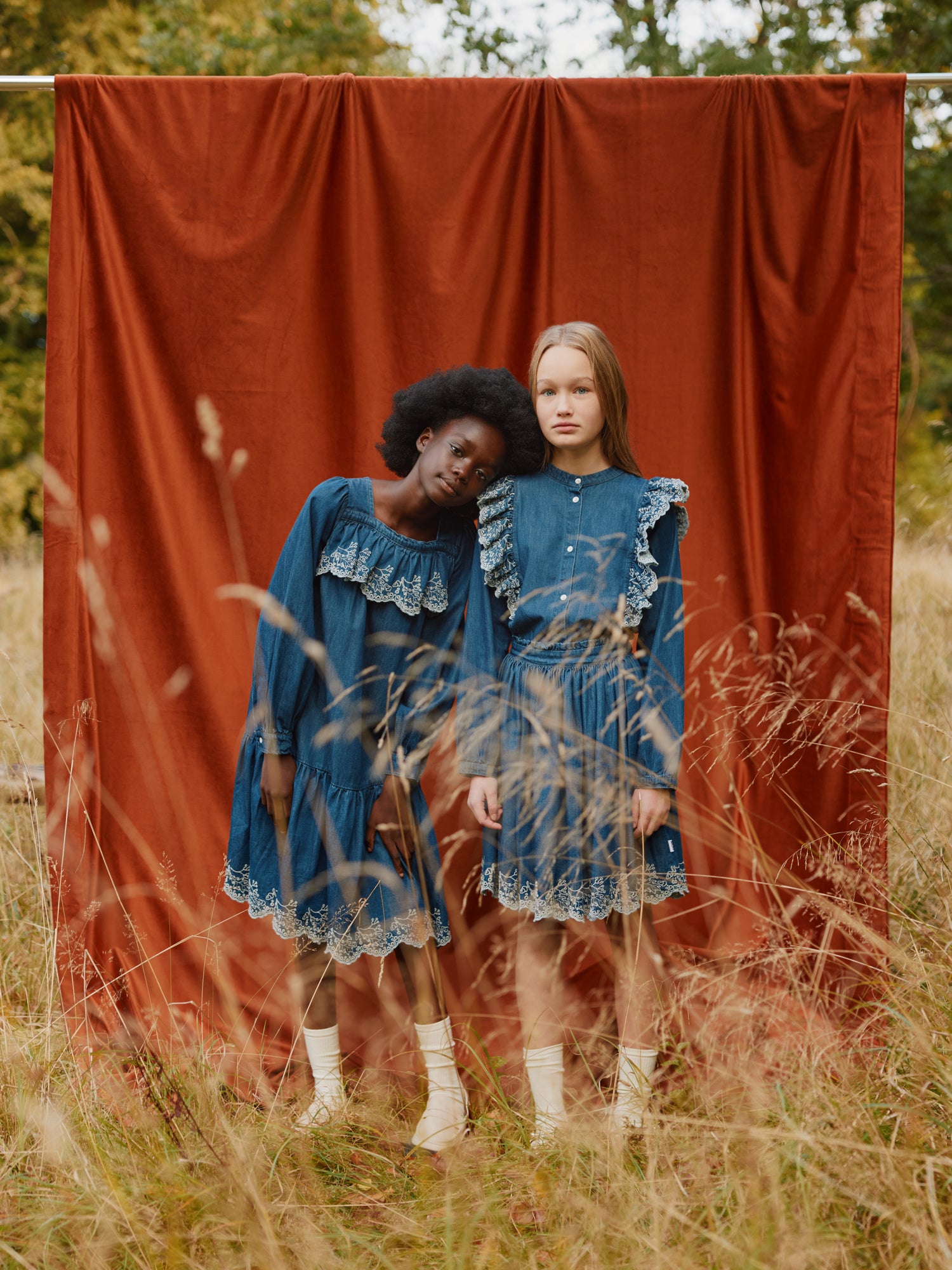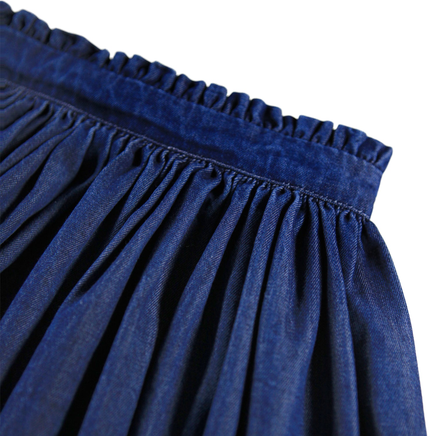 Blått skjørt laget av økologisk bomull chambray med hvitt broderi anglaise. Skjørtet går til kneet med en linning som er festet foran og strikk bak for å gjøre det enkelt å ta på og behagelig å ha på.