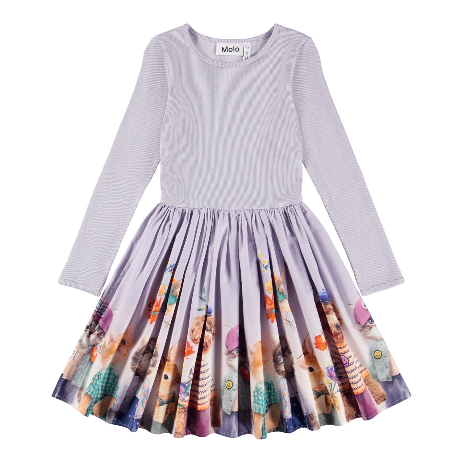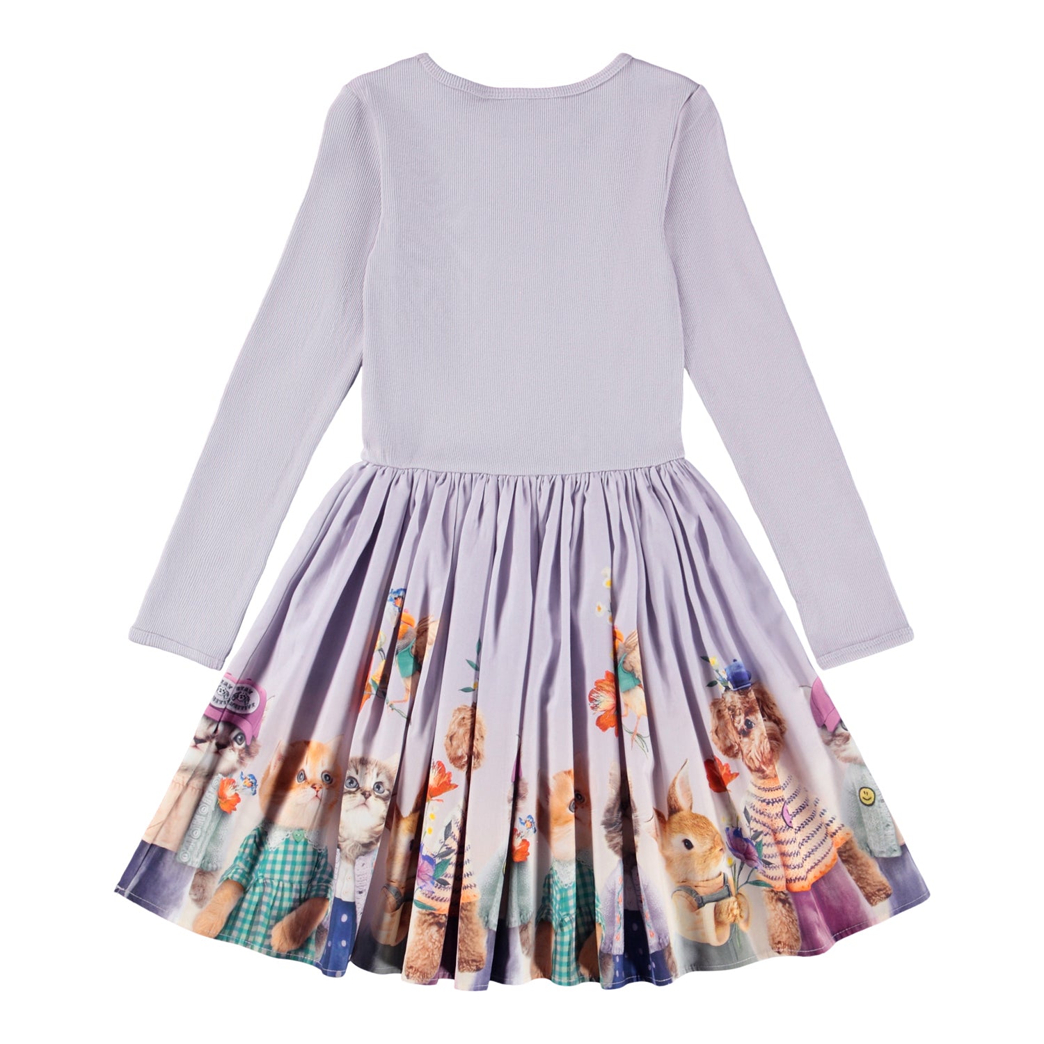 Langermet lys lilla kjole laget av økologisk bomull med en tettsittende ribbet jerseytopp og poplinskjørt. Kjolen har en vanlig passform med et trykk av dyr kledd i klær på skjørtet.