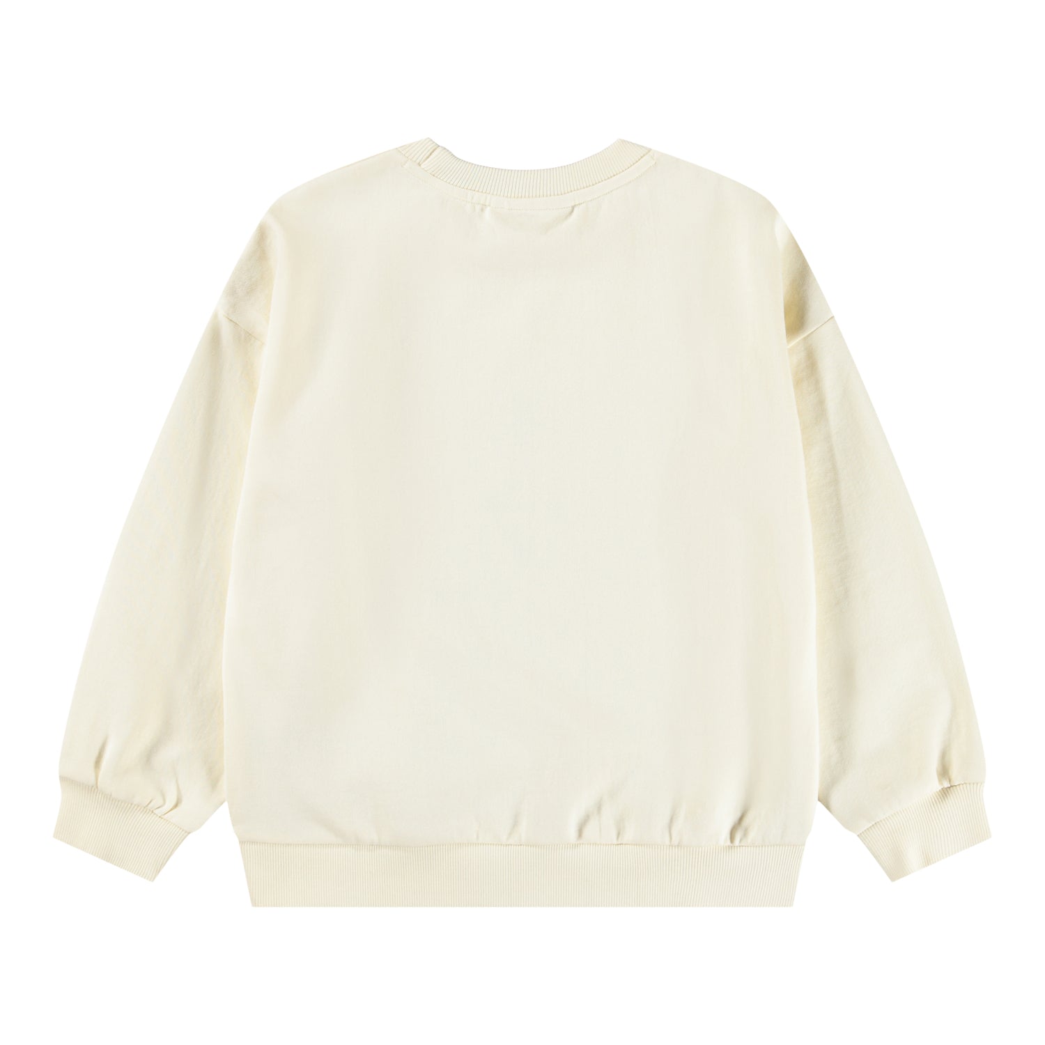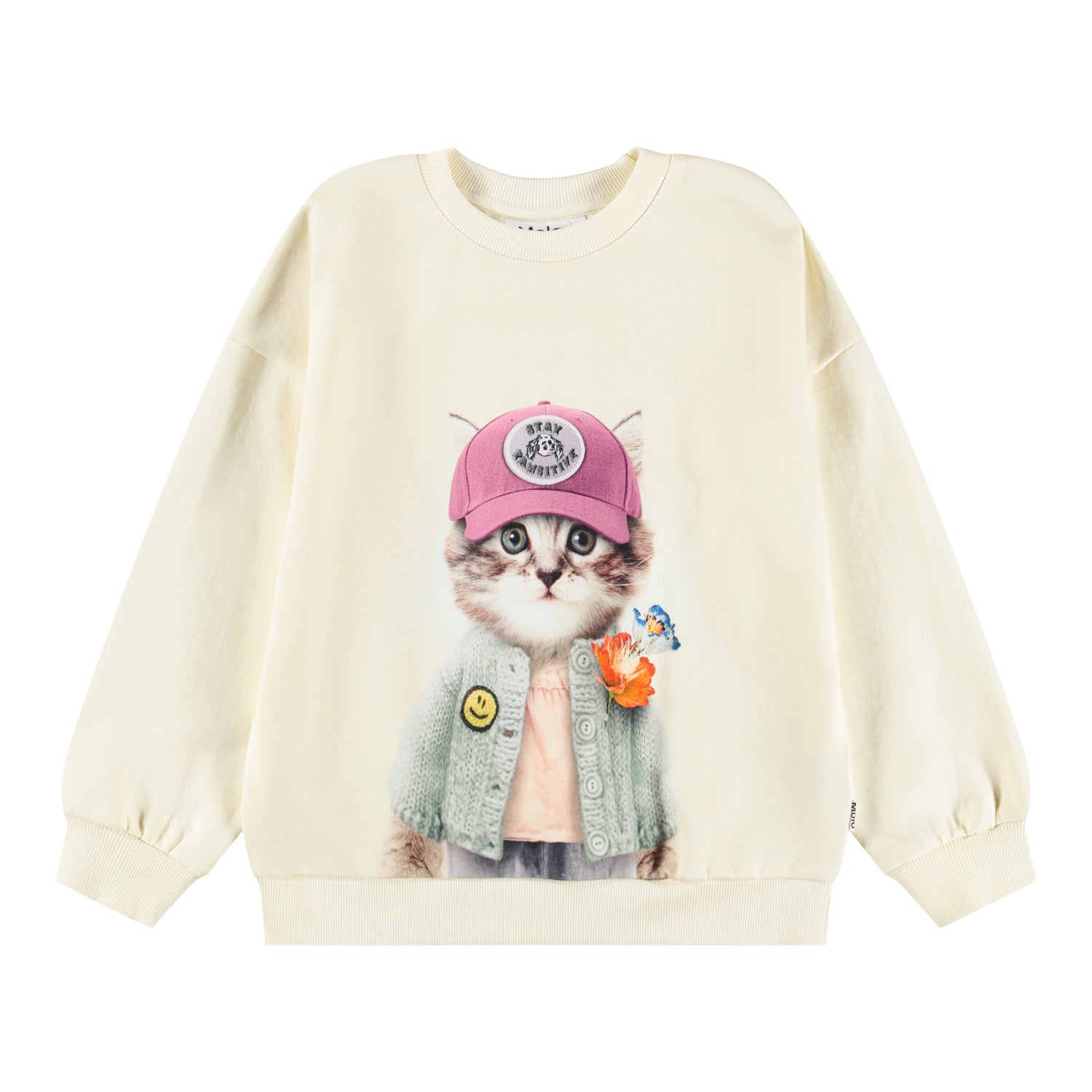Off-white genser laget av økologisk bomull. Genseren har en løs passform, rund hals, ribbekanter og et trykk av en søt katt kledd i klær. Dette Molo-produktet er GOTS Organic-sertifisert av Ecocert Greenlife
