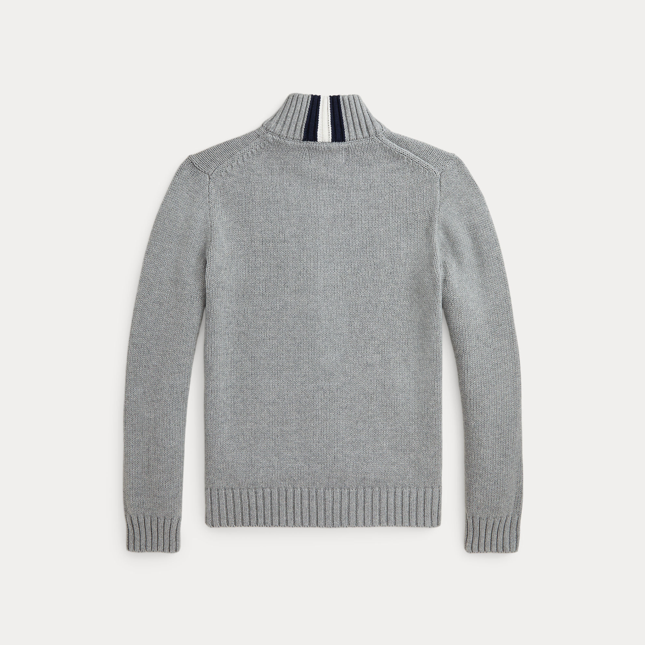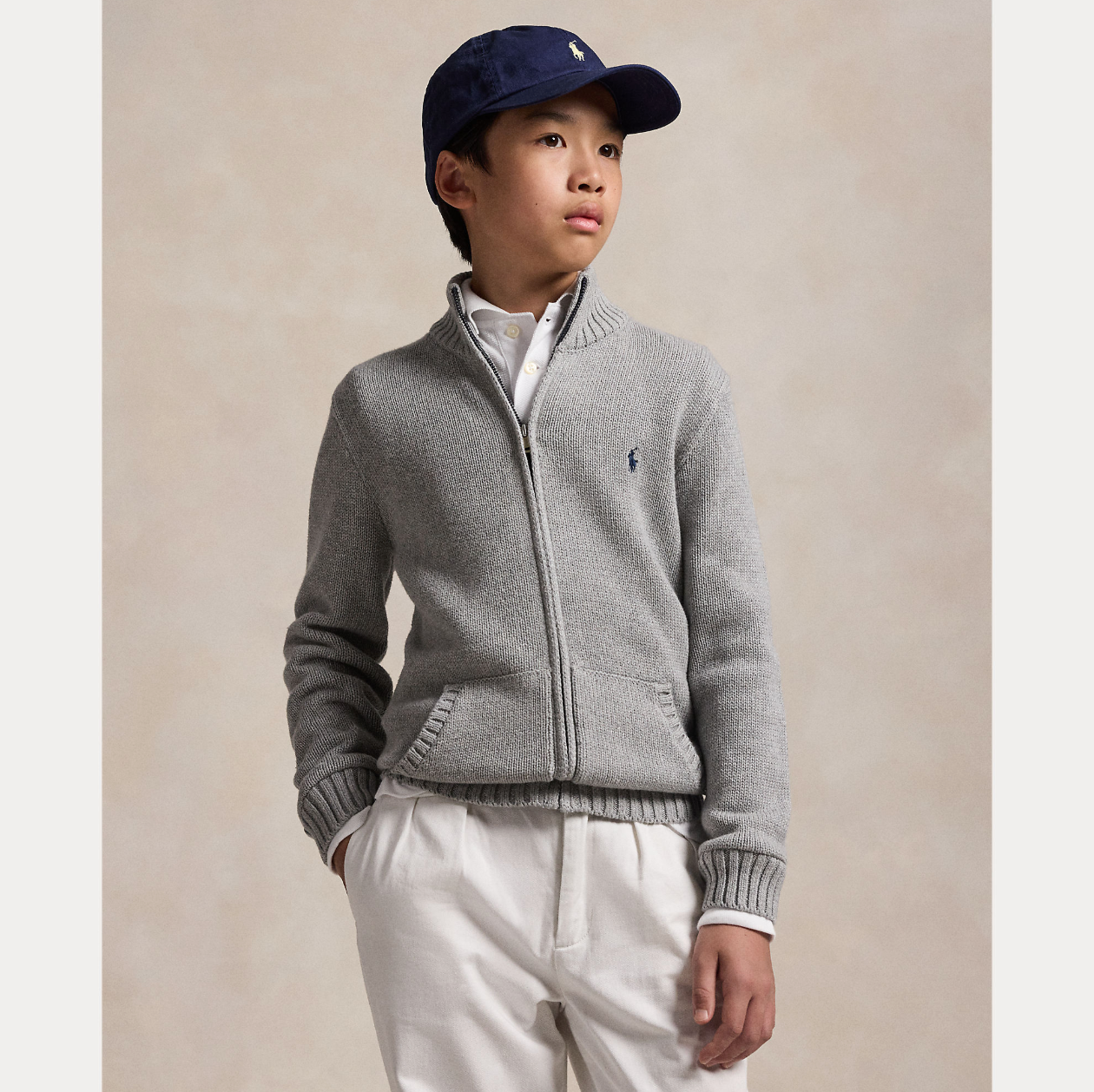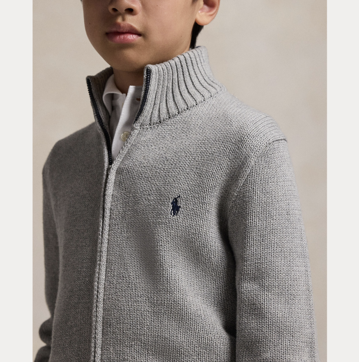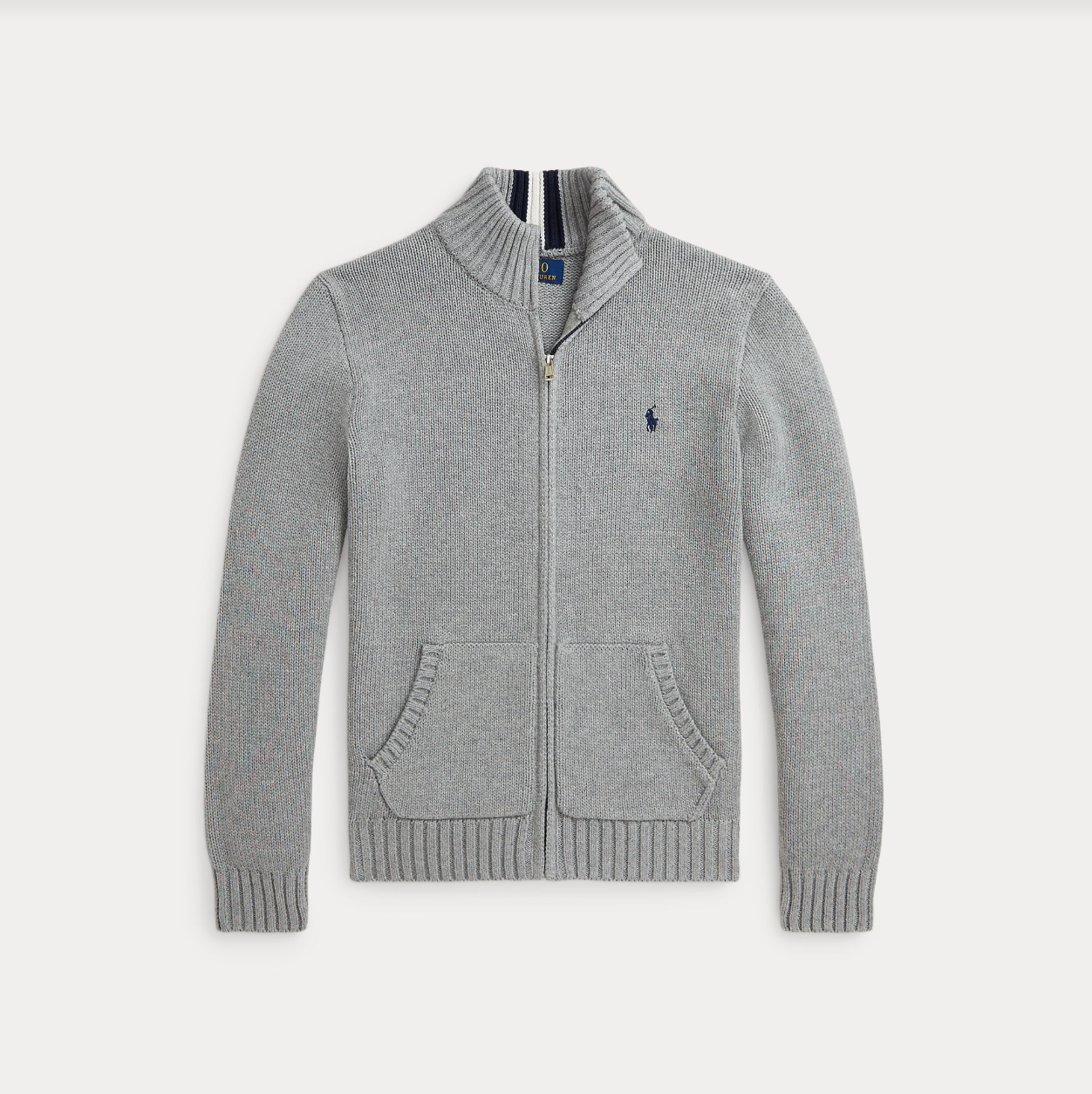 Denne grovstrikkede genseren er laget av myk, kjemmet bomull. Signaturbroderte Pony og full zip. Fin til både hverdag og selskap!