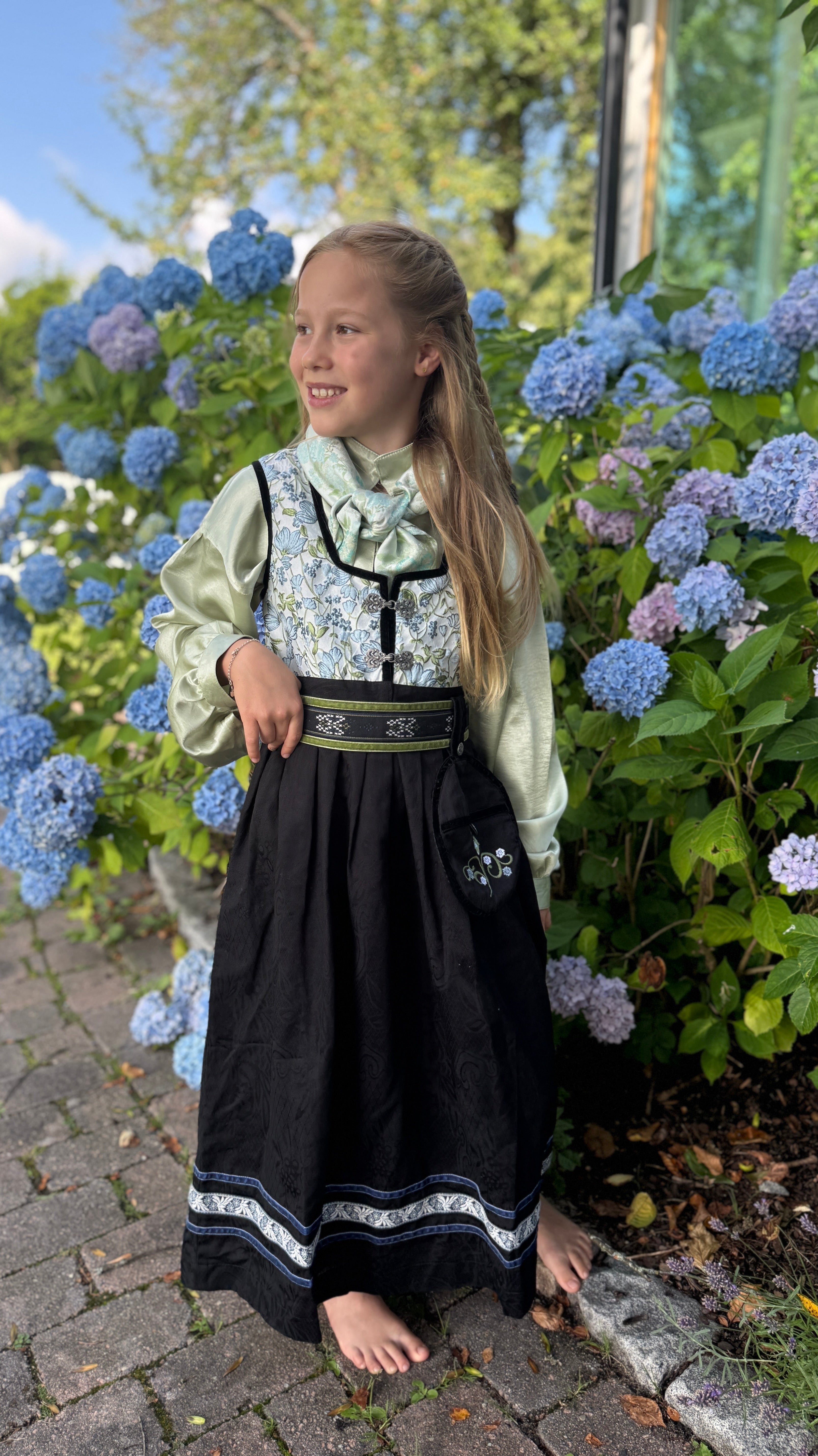Farge og Mønster: Det har et nydelig, vevd blomstermønster i toner av salviegrønn og turkis på en lys bunn. Mønsteret har et botanisk preg som harmonerer vakkert med Saltos nyere drakter.