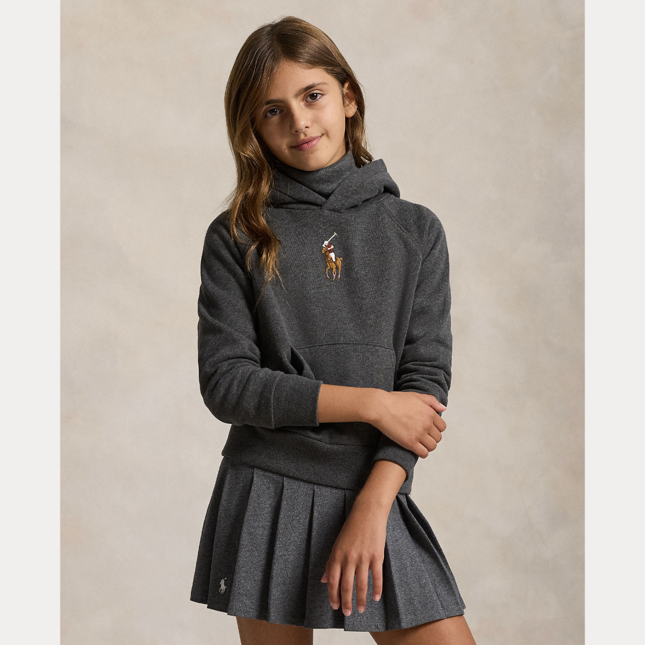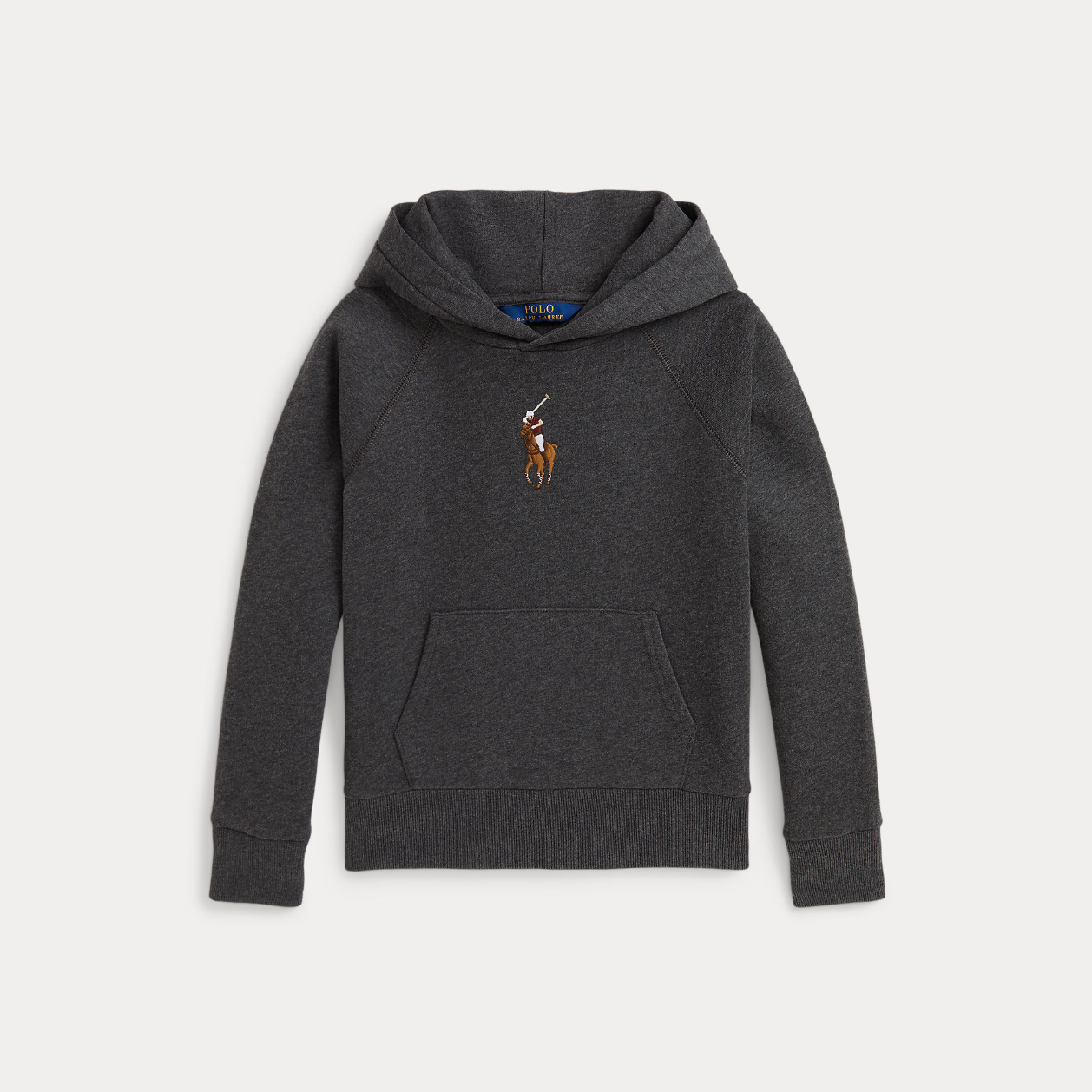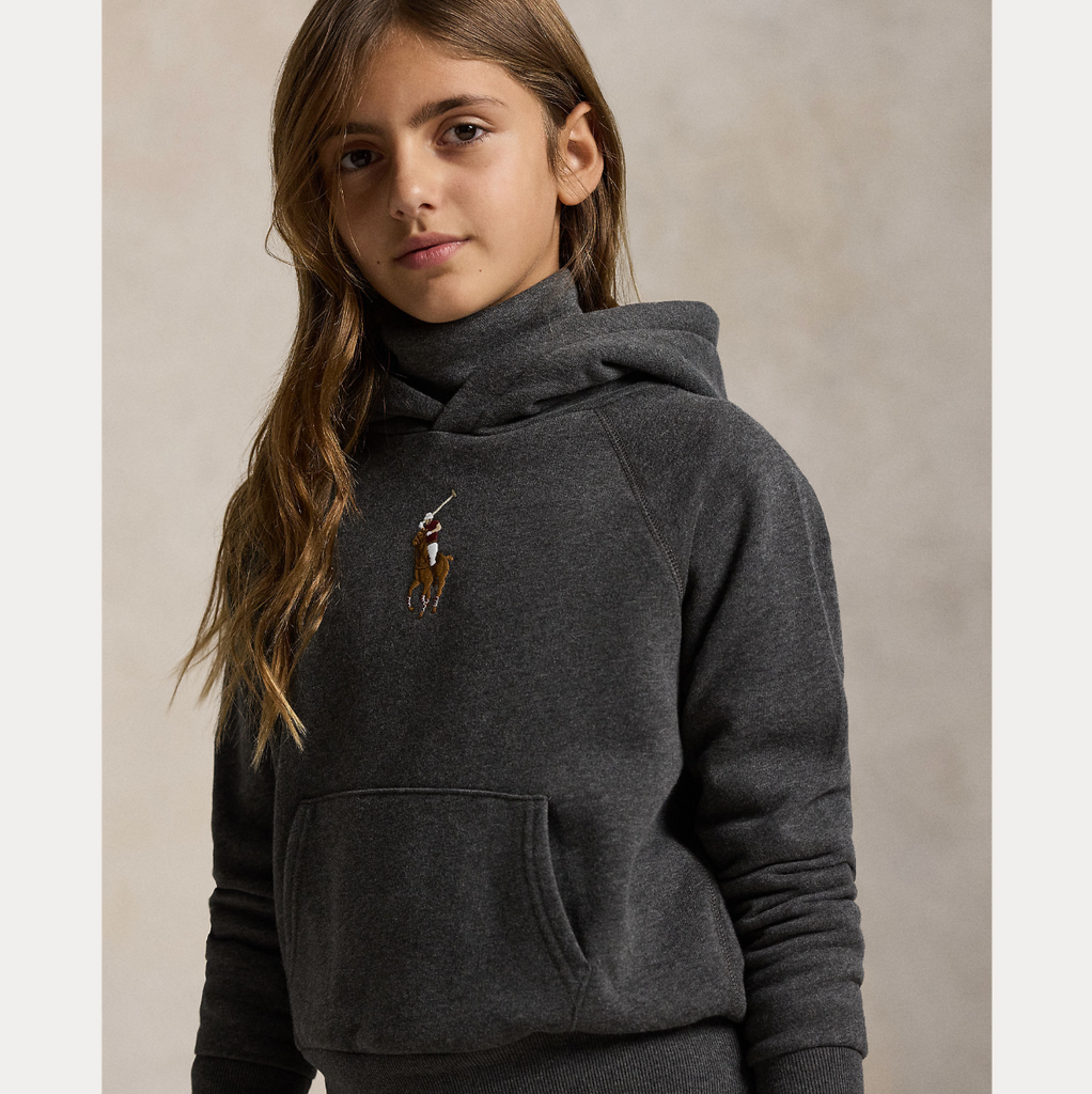 Denne hettegenseren er laget av gråfarget fleece i bomullsblanding og deretter vasket for enda bedre komfort. Foran gir den flerfargede broderte Polo-hesten en ikonisk Polo-finish.