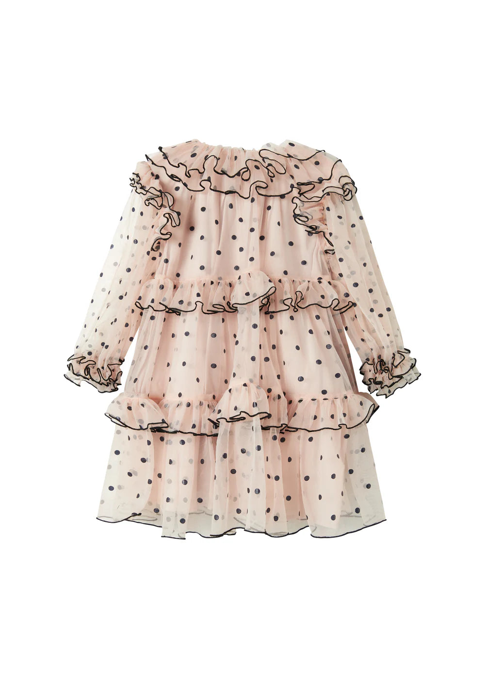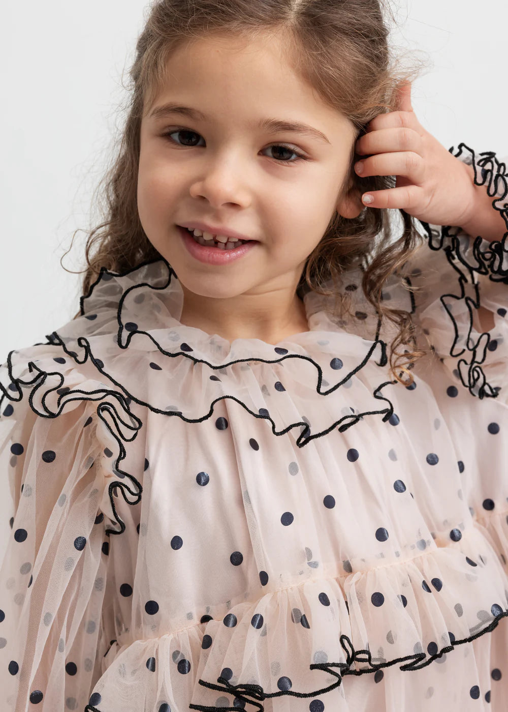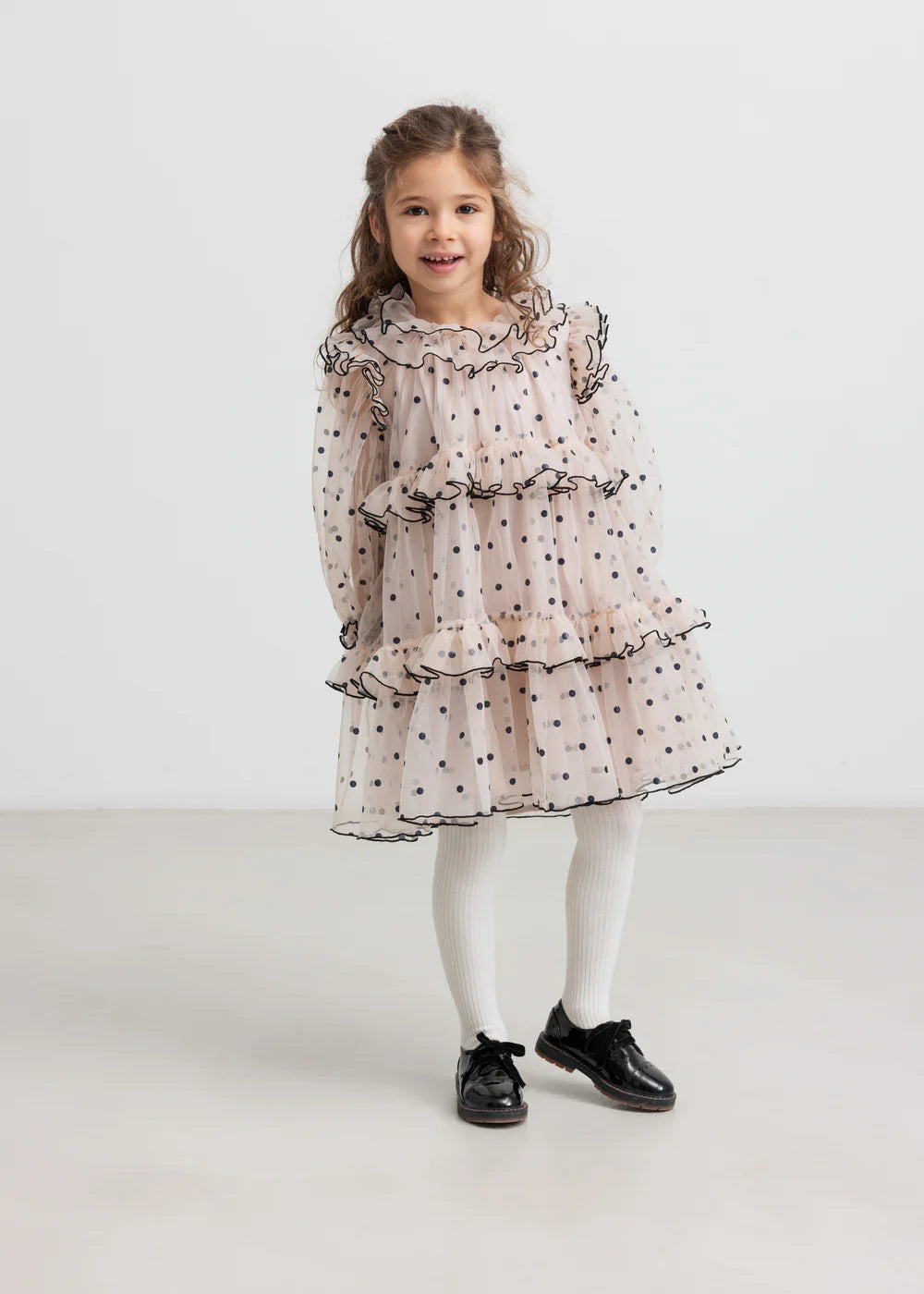 Kortermet barnekjole med mange lag tyll for volum. Kjolen har vakre metalliske prikker, en fin rund krage med tyllrysjer og kontrasterende kanter. Kjolens lengde går over knærne.