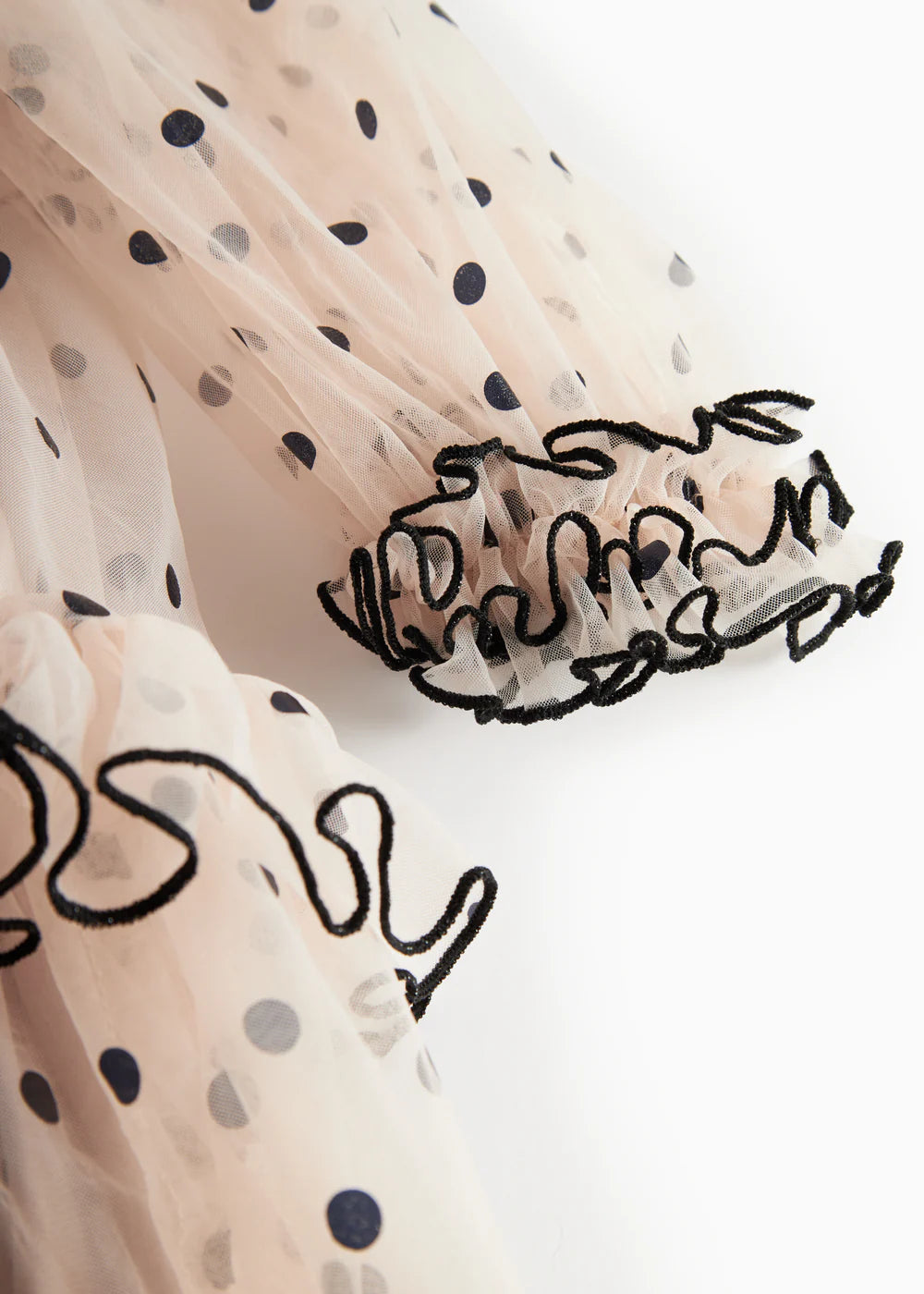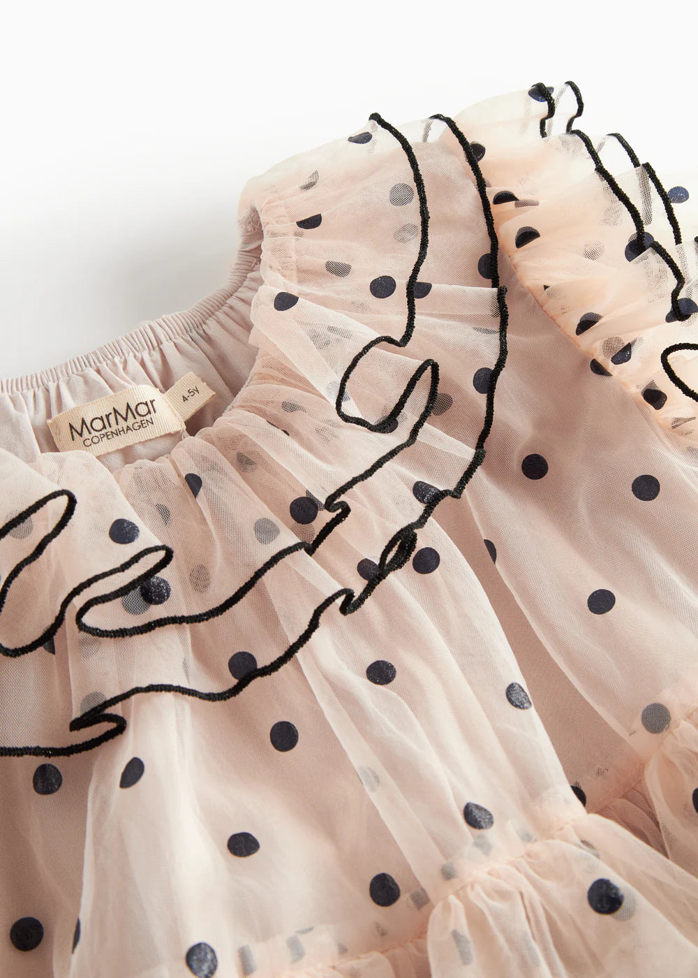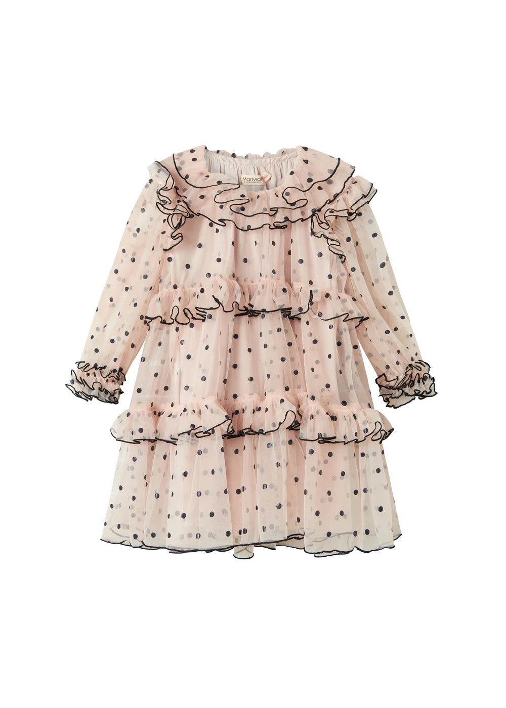 Kortermet barnekjole med mange lag tyll for volum. Kjolen har vakre metalliske prikker, en fin rund krage med tyllrysjer og kontrasterende kanter. Kjolens lengde går over knærne.