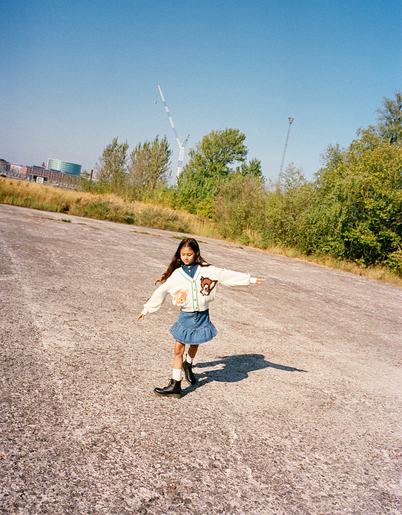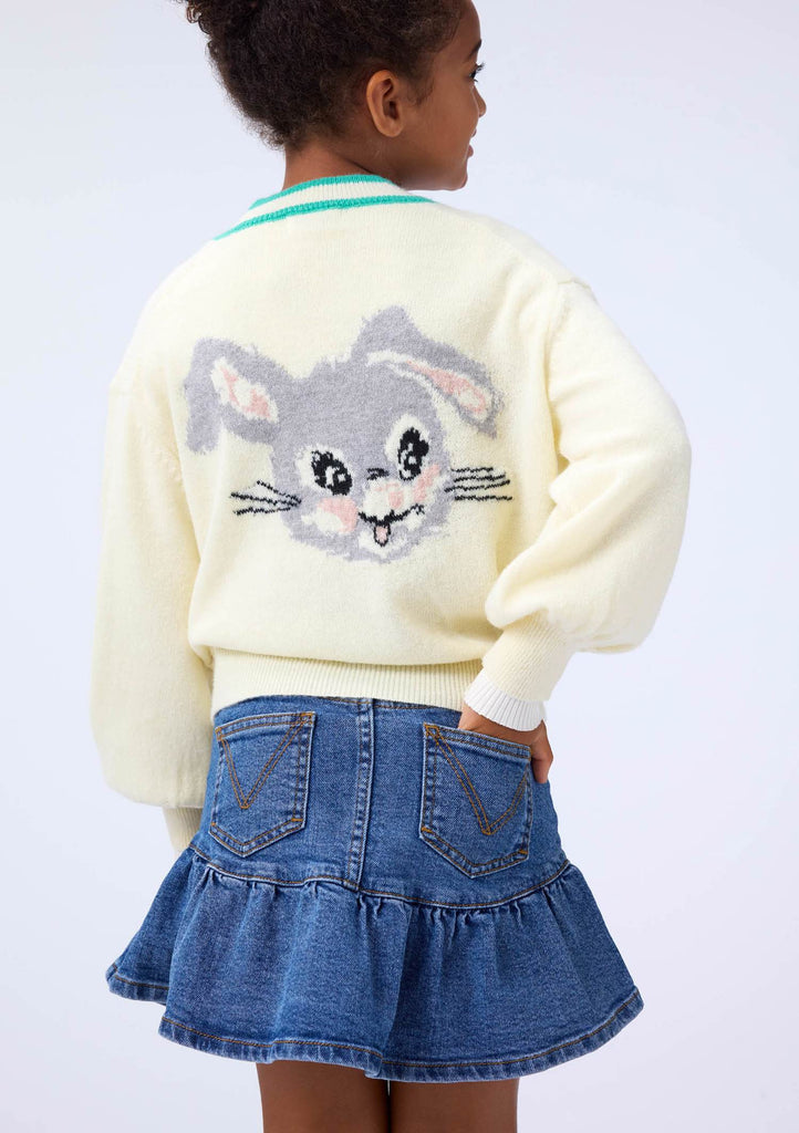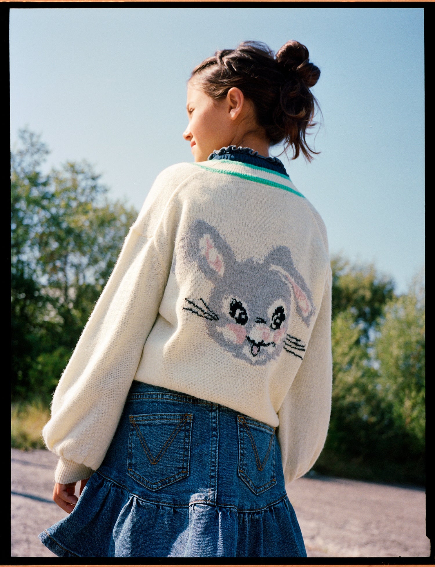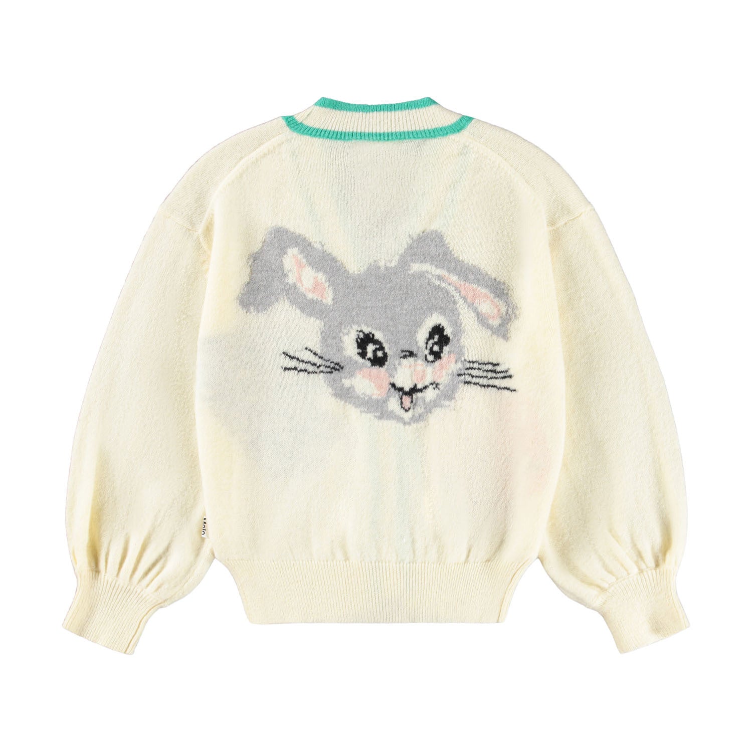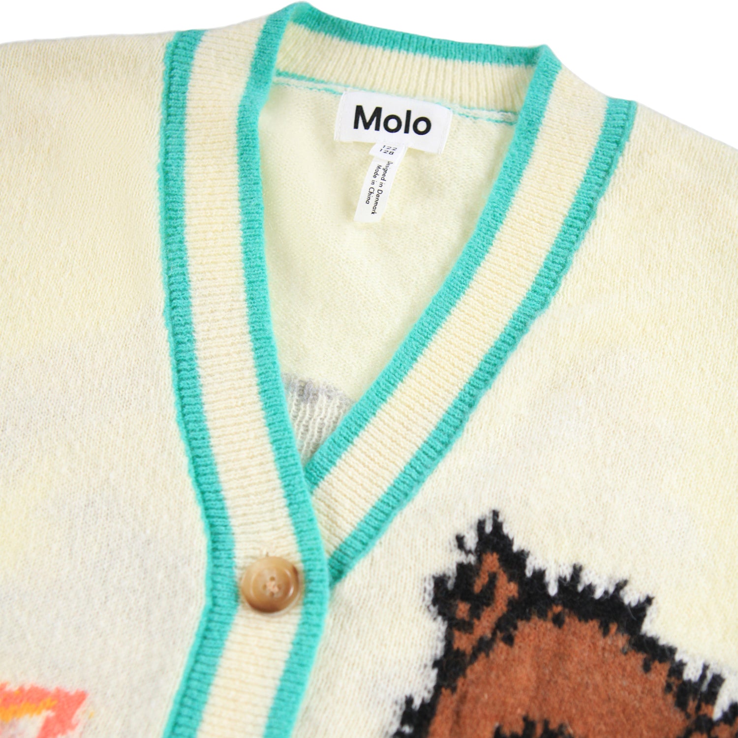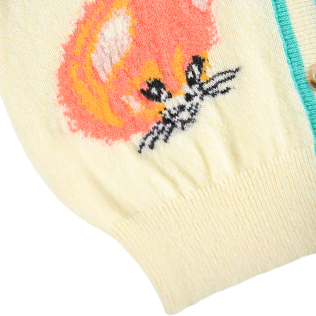 Morsom off-white cardigan laget av en ullblanding. Denne cardiganen har mange fine detaljer, som et vakkert jacquardvevd mønster av søte dyr, grønne paneler langs halsen og knappene, samt en fin knappelukking hele veien ned. Denne cardiganen har V-hals, ballongermer og ribbekanter rundt ermene og i midjen.