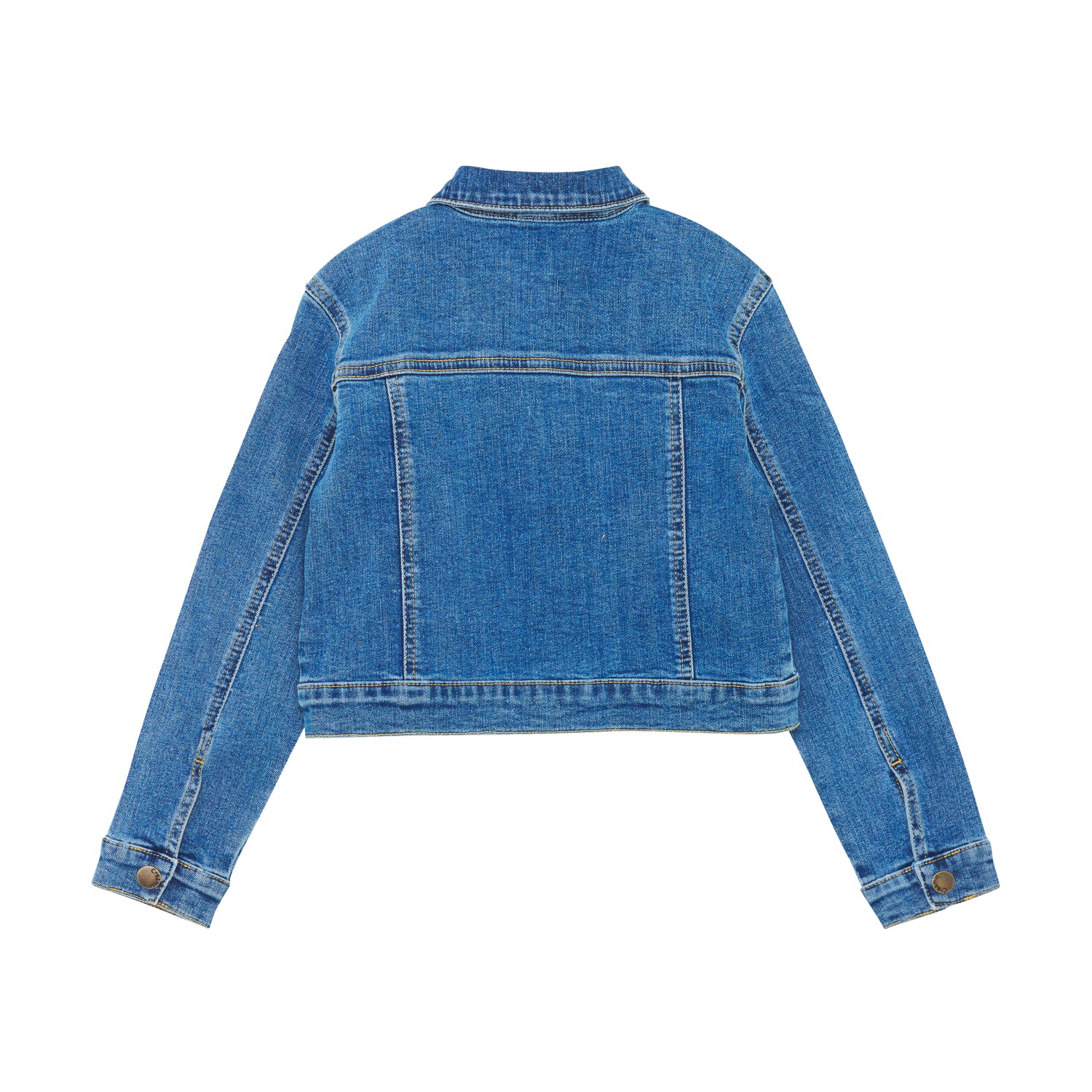 Blå denimjakke med krage fra Creamie. Jakken har strass foran, snitt bak og lukkes med praktiske trykknapper.