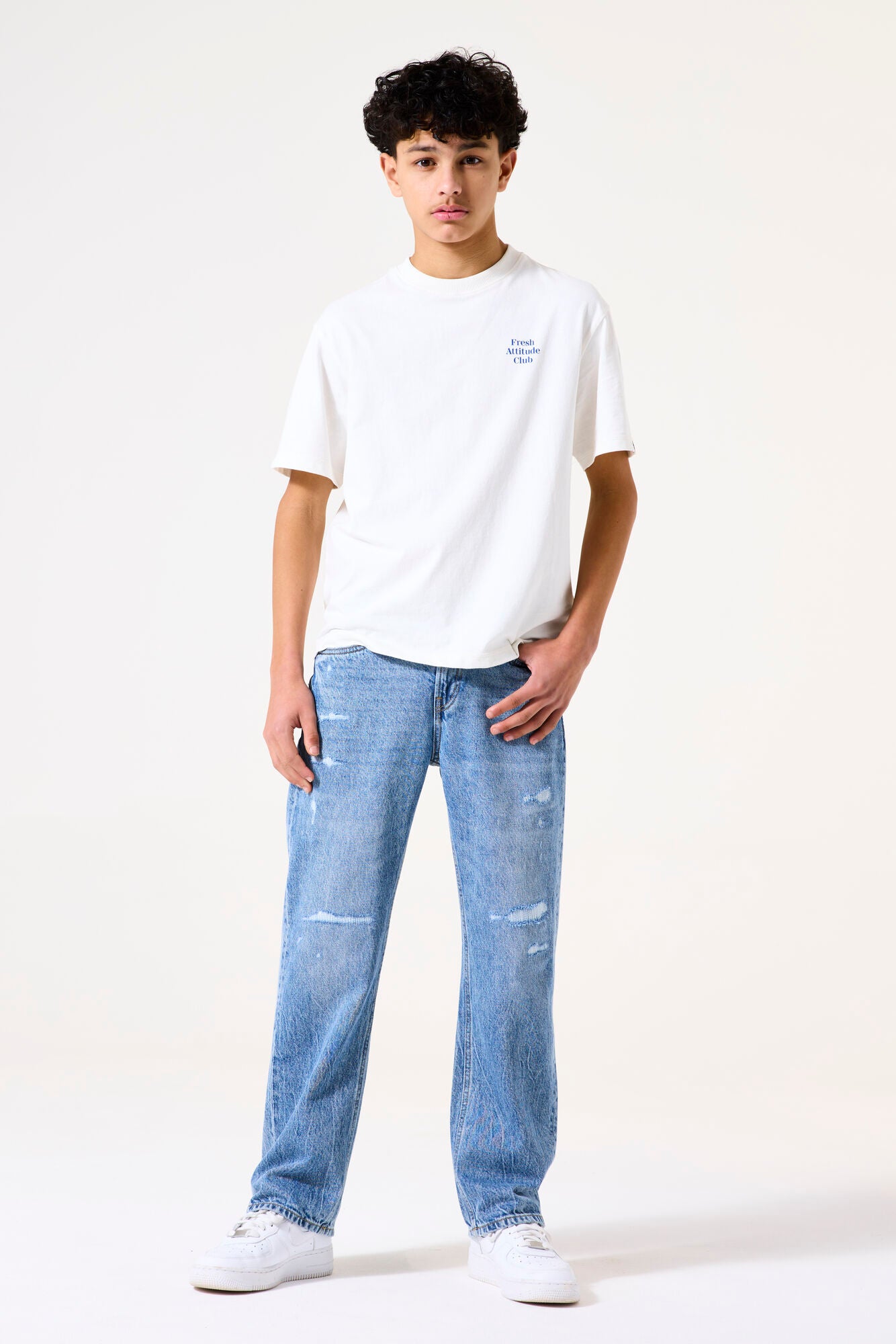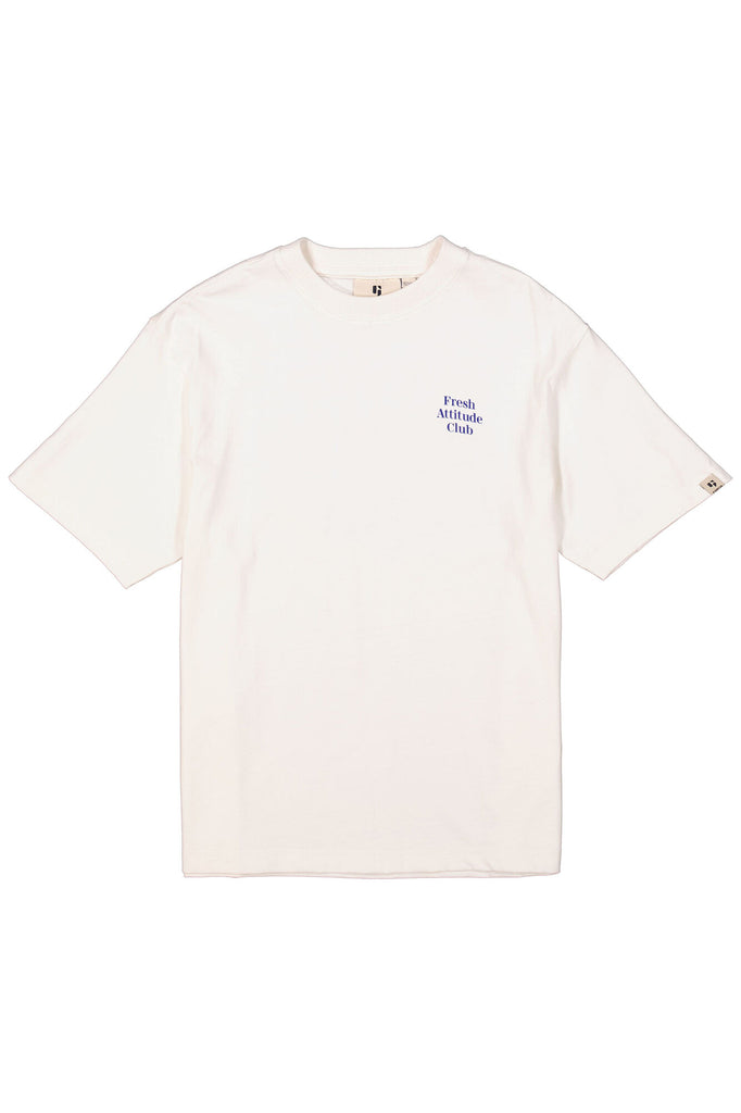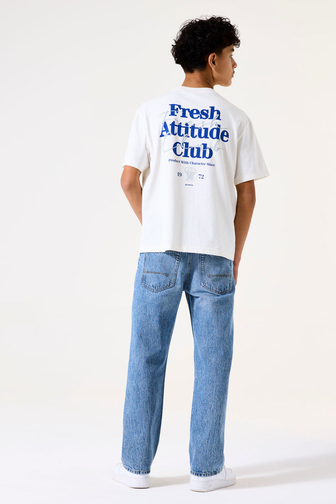 Stilig T-skjorte med teksttrykk, perfekt for tenåringer som ønsker å kombinere stil og komfort. Denne T-skjorten har rund hals, korte ermer og en løs passform. Dette plagget er laget av 50 % bomull og 50 % resirkulert bomull.